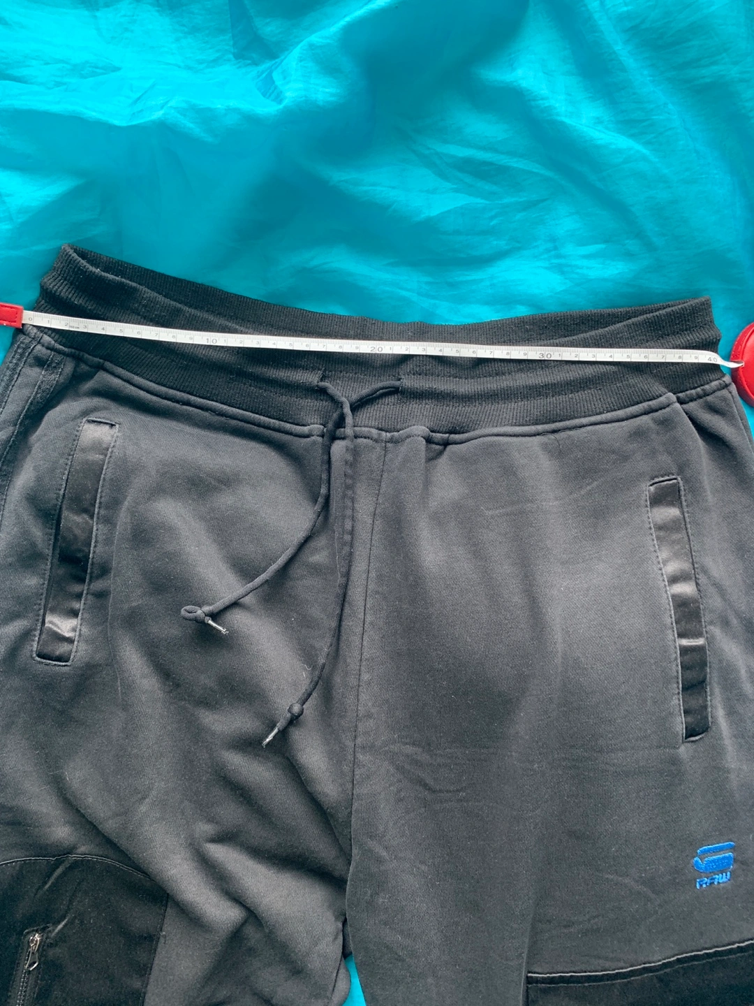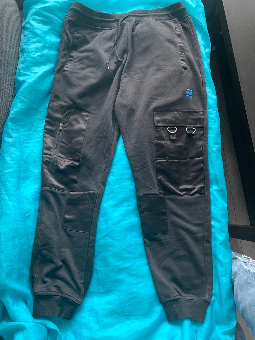 Men's black joggers. Features cargo pockets and a drawstring waistband. Cuffed hems. Great for casual wear.