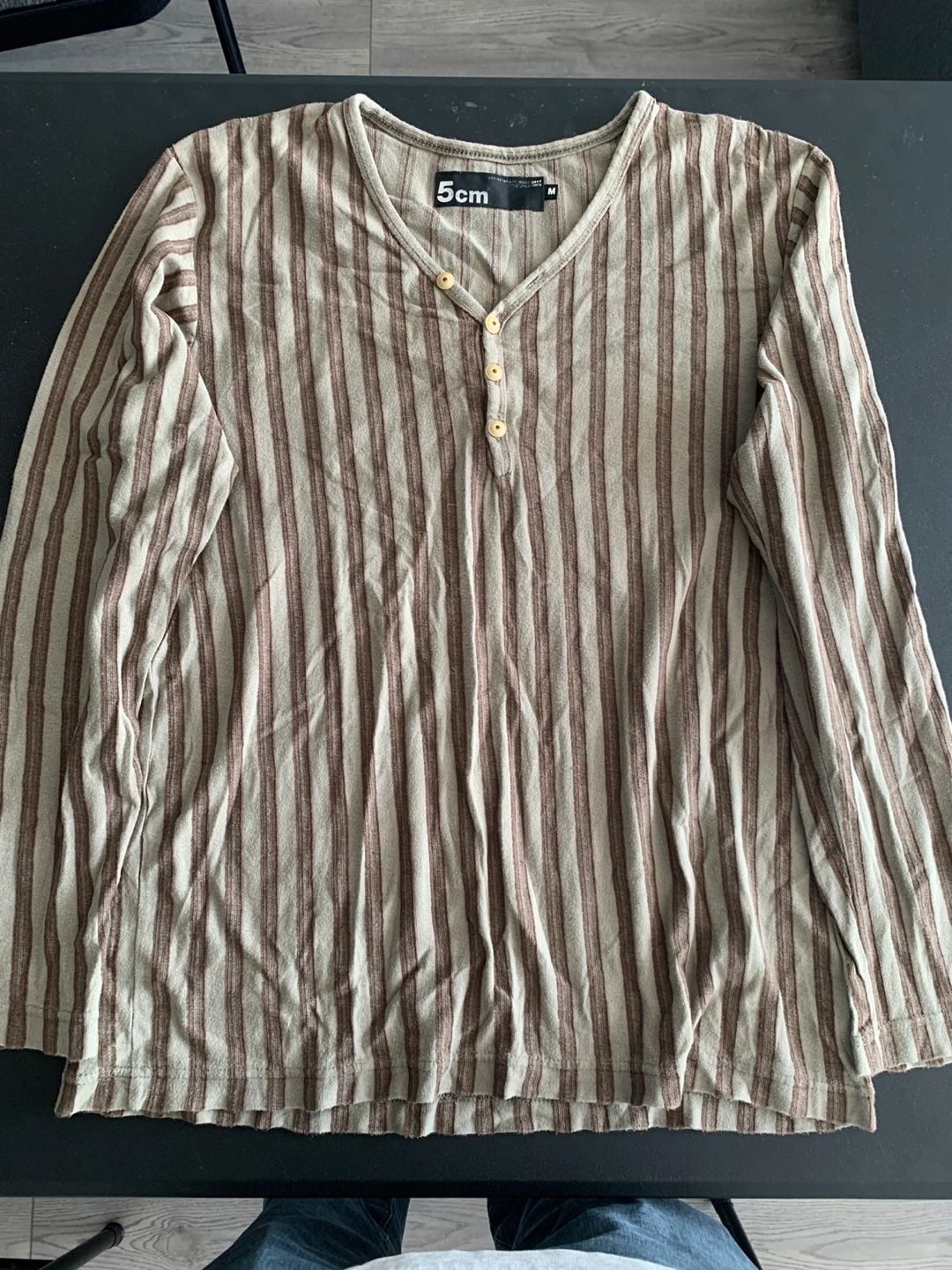 Men's long sleeve shirt. Vertical stripes, beige and brown. Henley style placket. Size medium.