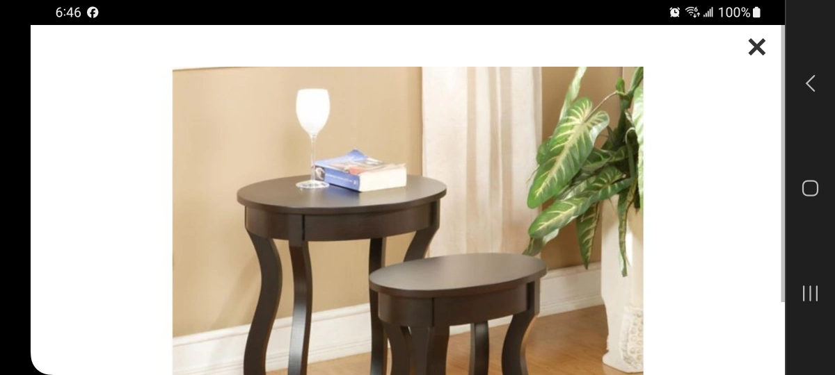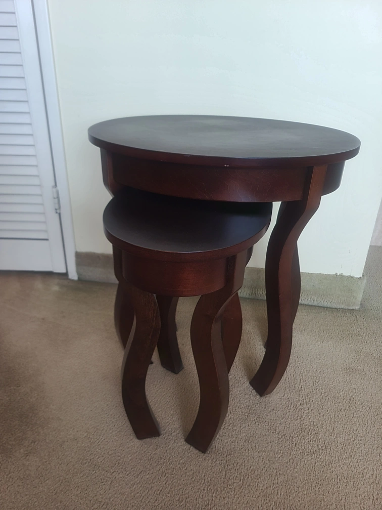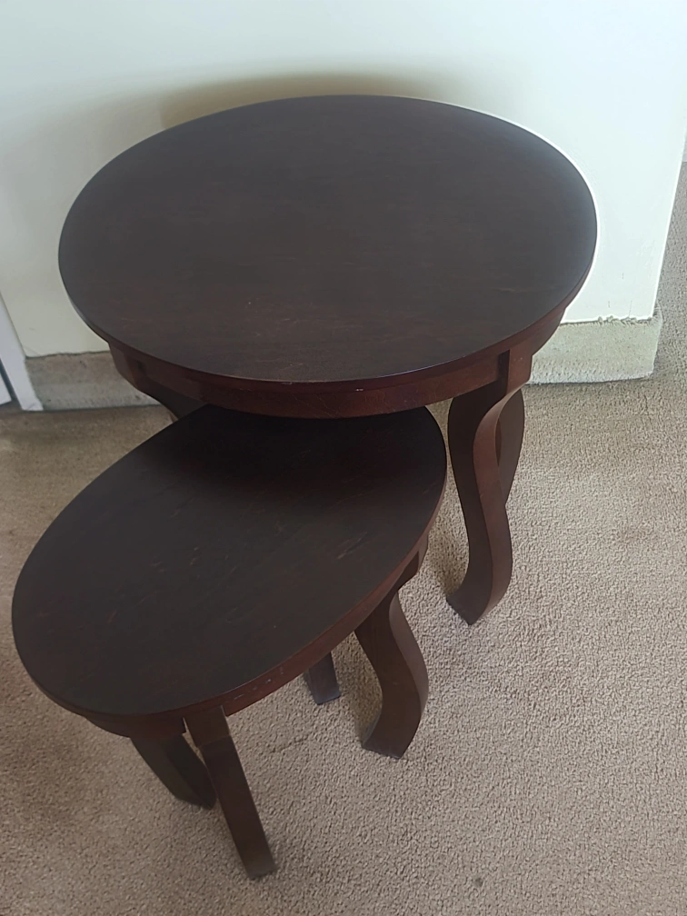 Veronica Collection Set of two nested oval side tables. Dark brown wood finish. Unique curved legs. Perfect for small spaces. Simple clean lines for this 2 piece nesting table set. Stylish curved legs and oval tops made out of select solids and wood veneers in a Dark Walnut colour. 2 table sizes in large & medium that neatly tuck away is an entertainers delight. Other pieces also available in the Veronica collection.
