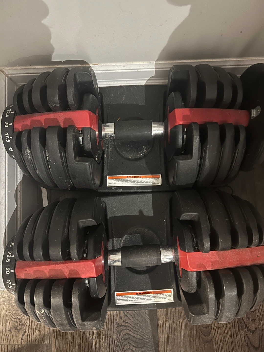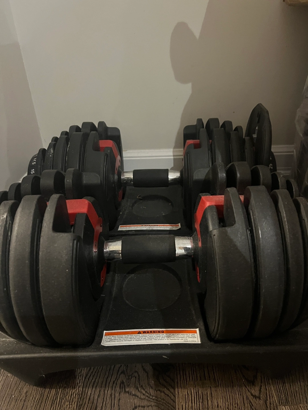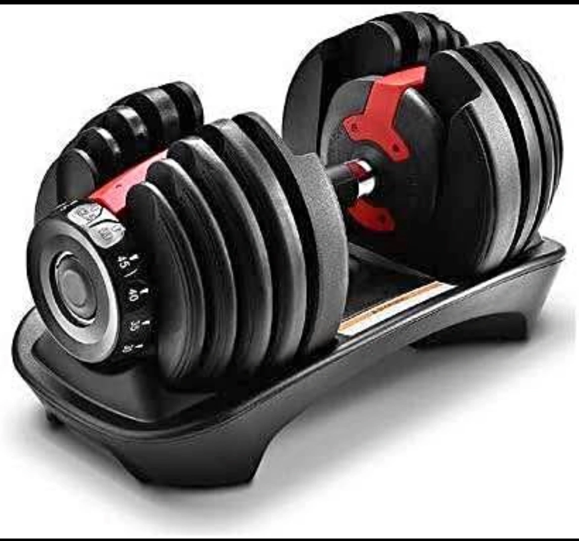 Pair of adjustable dumbbells. Weights range from 5 lb to 52.5 lb. Includes a convenient storage rack. Great for home workouts.