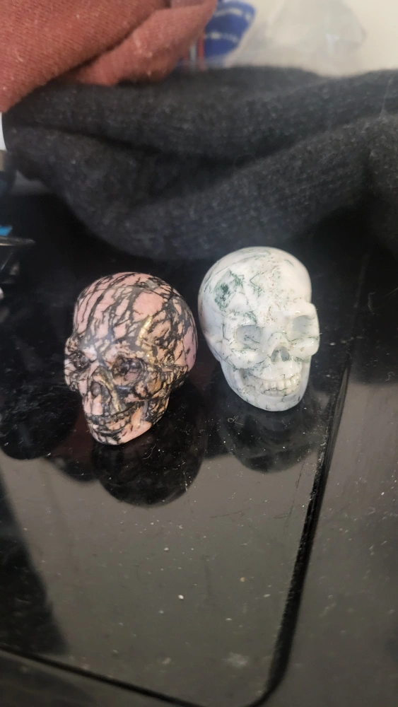 Two small skulls carved from pink and black rhodonite and moss agate.