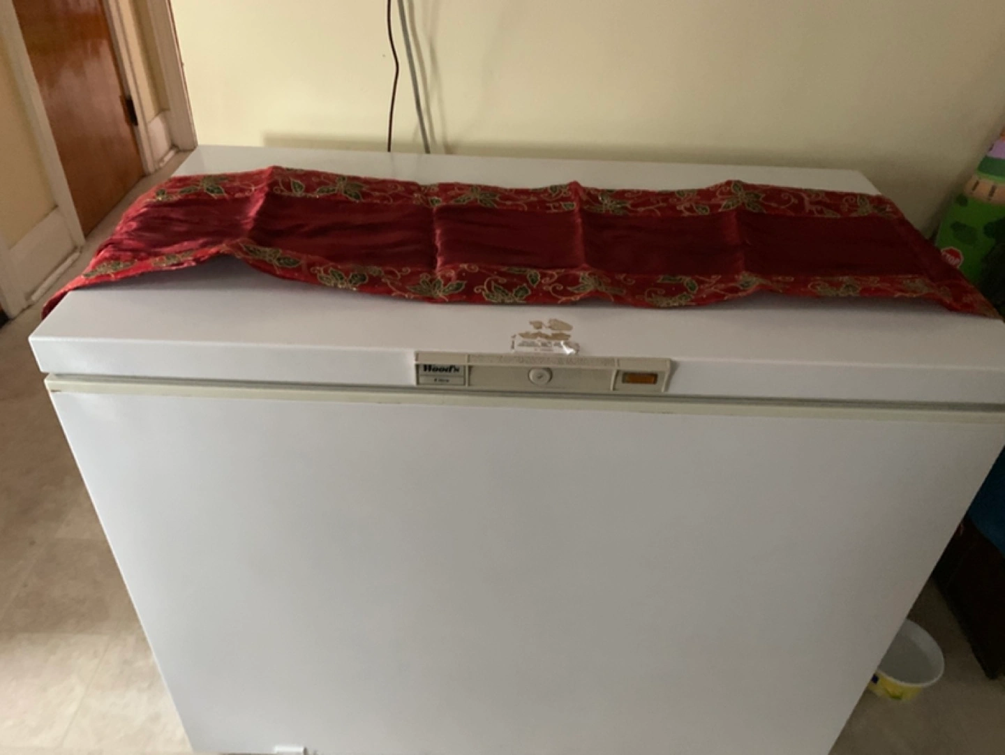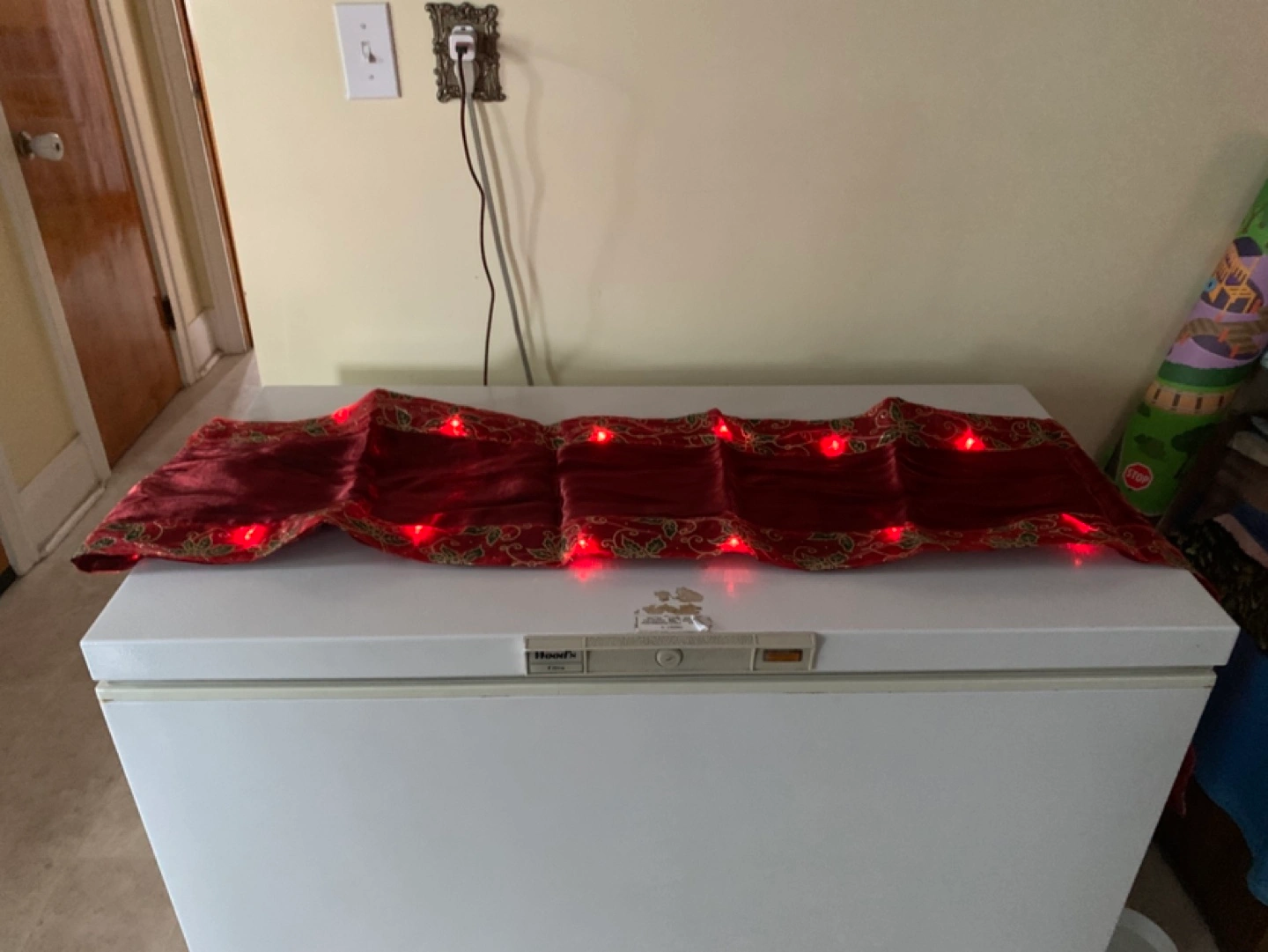 Battery-operated Christmas table runner. Red satin with gold accents. Features integrated LED lights. Perfect for holiday decor. Measures approximately 33 inches long. Requires 2AA batteries. Only used a few times. Too big for my table.