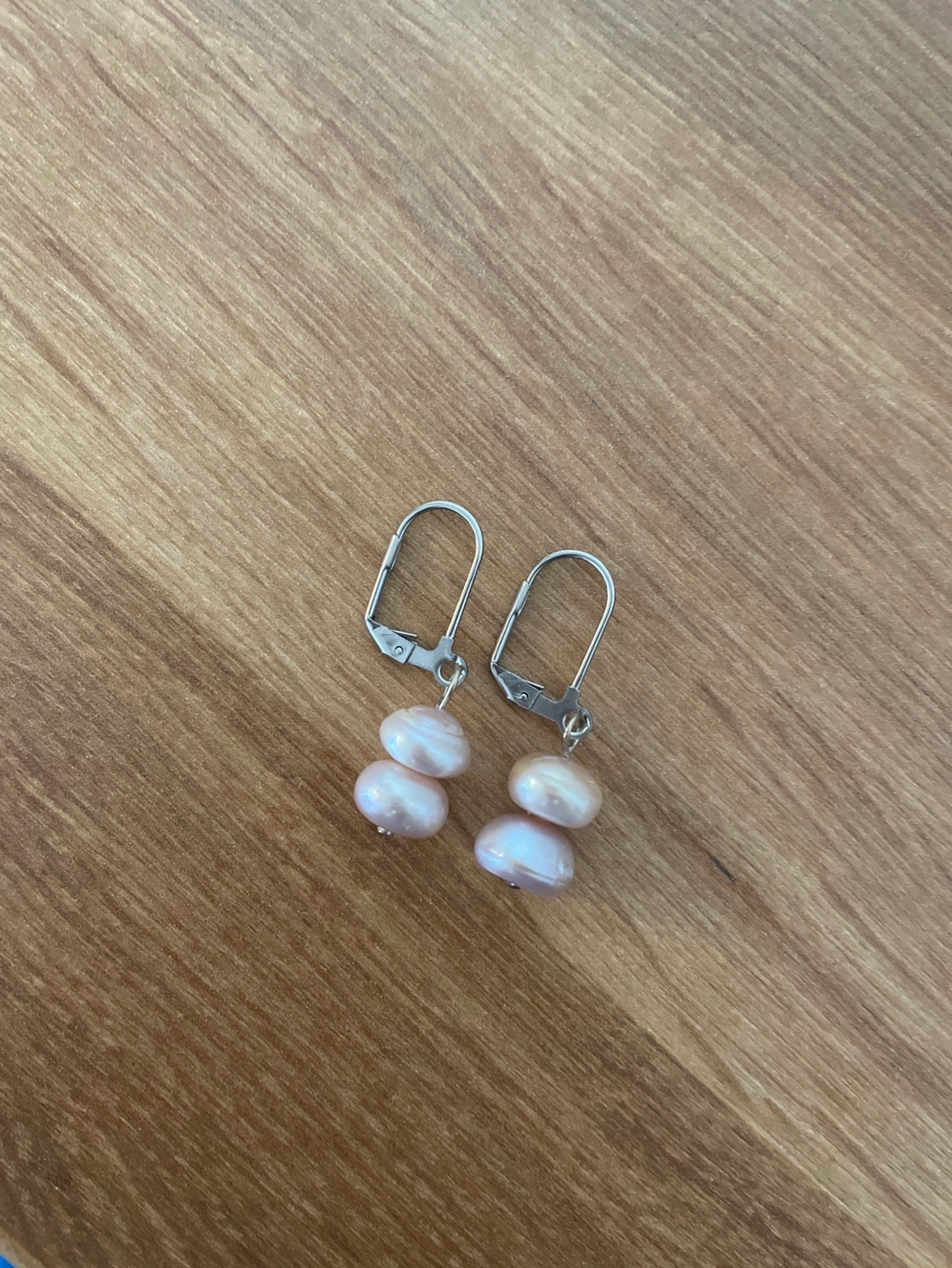 Lovely pair of earrings. Features two pale pink pearls on each earring. Silver-toned leverback stainless steel closure. Perfect for everyday wear.