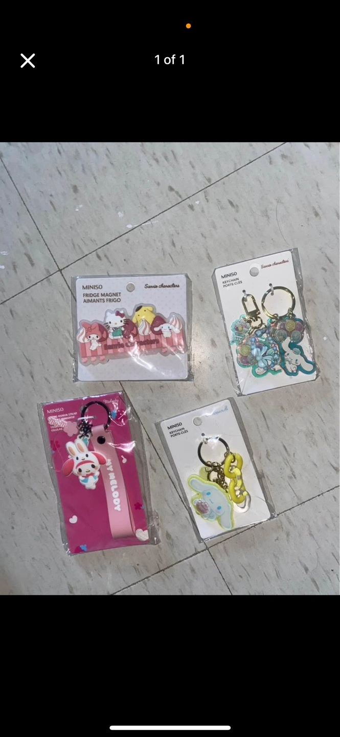 Four Sanrio character themed items from Miniso. Includes a fridge magnet featuring Hello Kitty, My Melody, Kuromi, and Cinnamoroll. Also three keychains; one features My Melody, another features Cinnamoroll, and the last features assorted Sanrio characters. Pick up only and cash!!