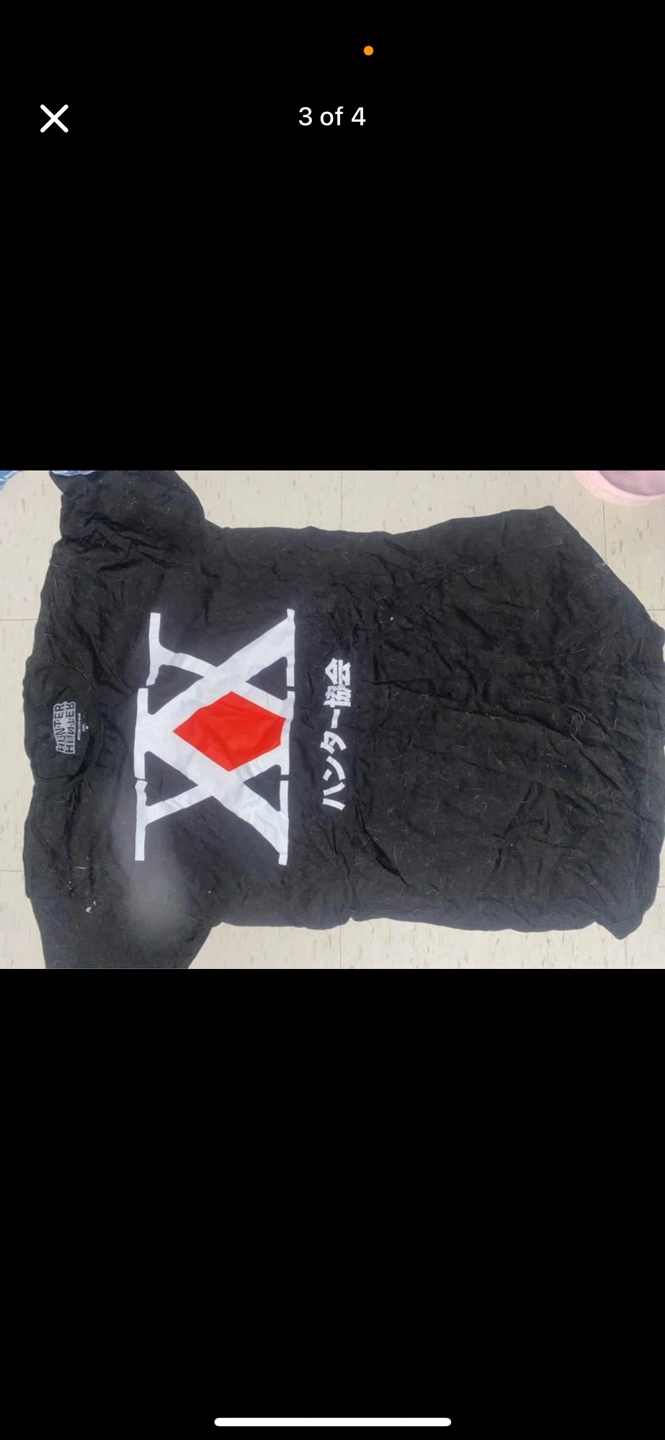 Black T-shirt, large size. Features a Hunter x Hunter graphic on one and a tropical print on the other. New with tags. Pick up only and cash!!