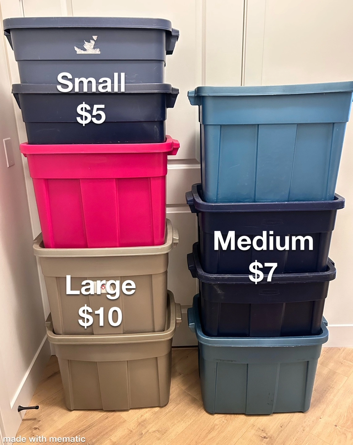 Set of plastic storage bins. Three sizes available: small, medium, and large. Various colours including pink, taupe, navy, and teal. Price varies by size. All are clean and ready to use. Have 2 large left as of July 16