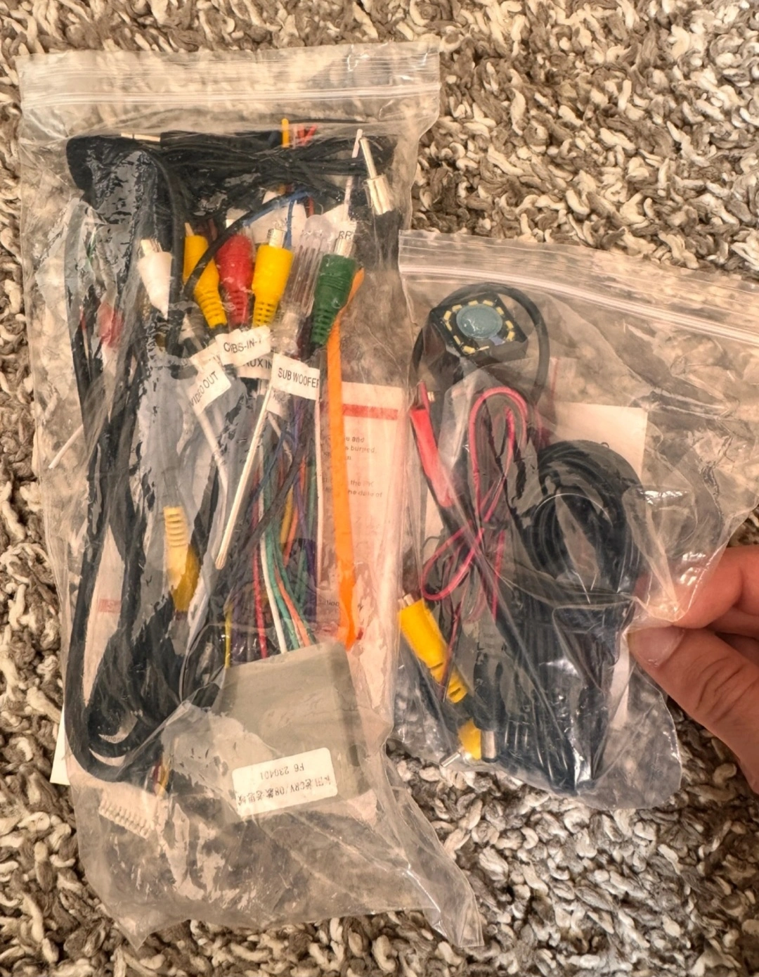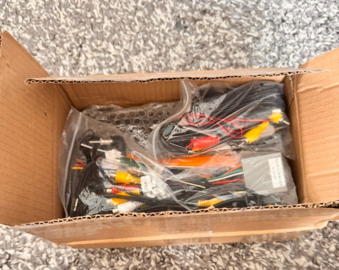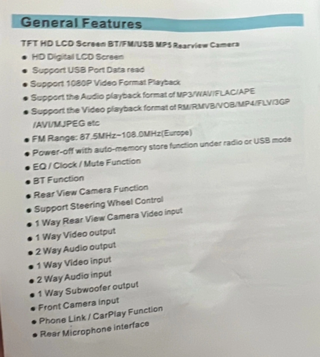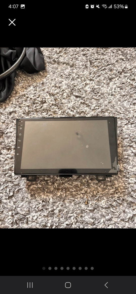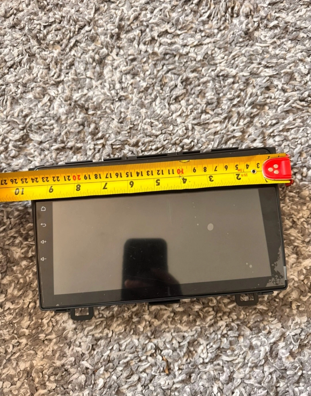 7 inch touchscreen car stereo. Includes wiring harness and backup camera. Never used. Approximately 7 inches.