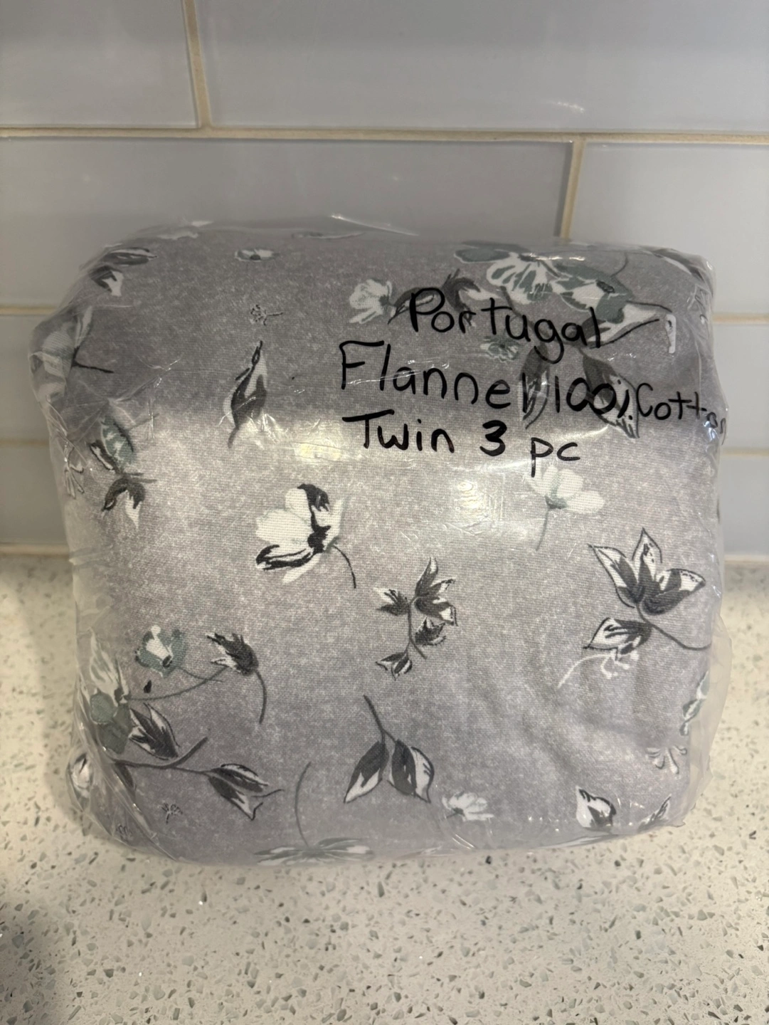 Grey floral print, 100% cotton flannel. Twin size, 3-piece set. New, in plastic packaging. Pick up in St Clements