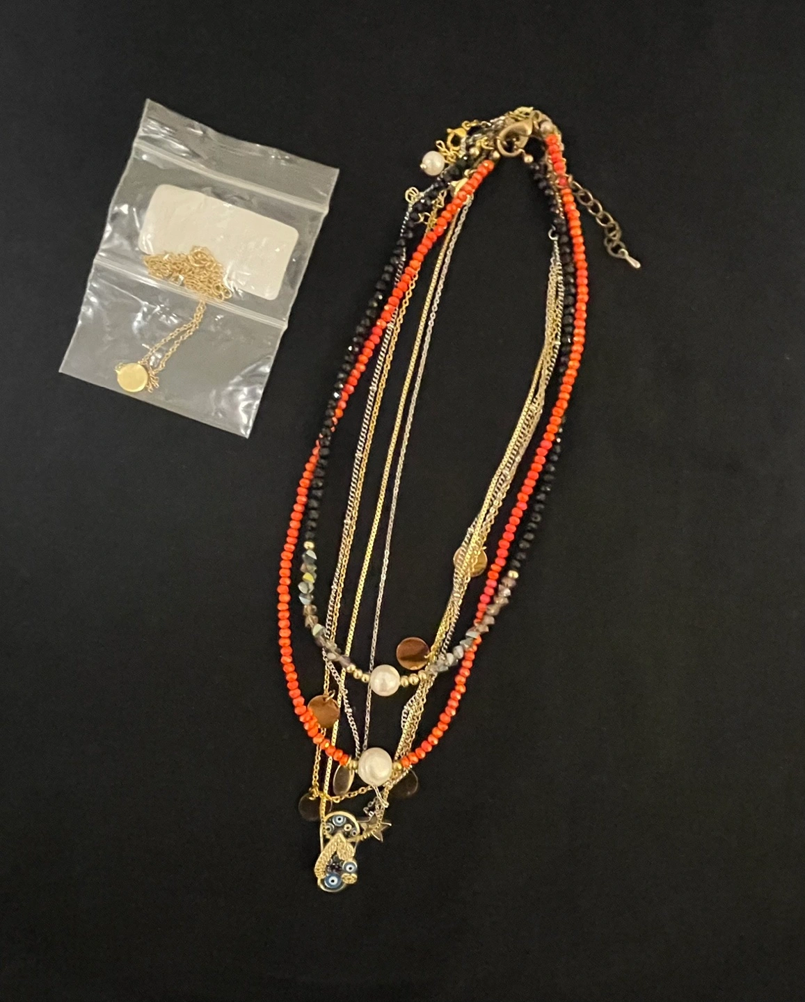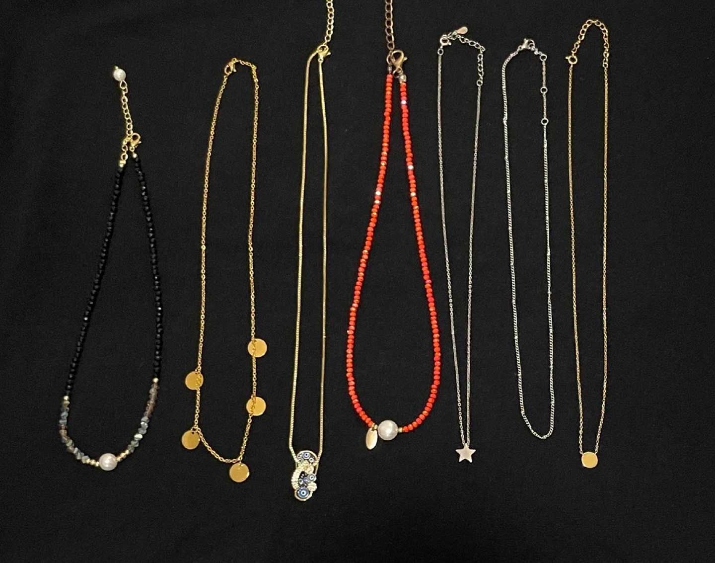 7 delicate necklaces, various styles and colours. Includes gold chains, beaded necklaces, and pendants.