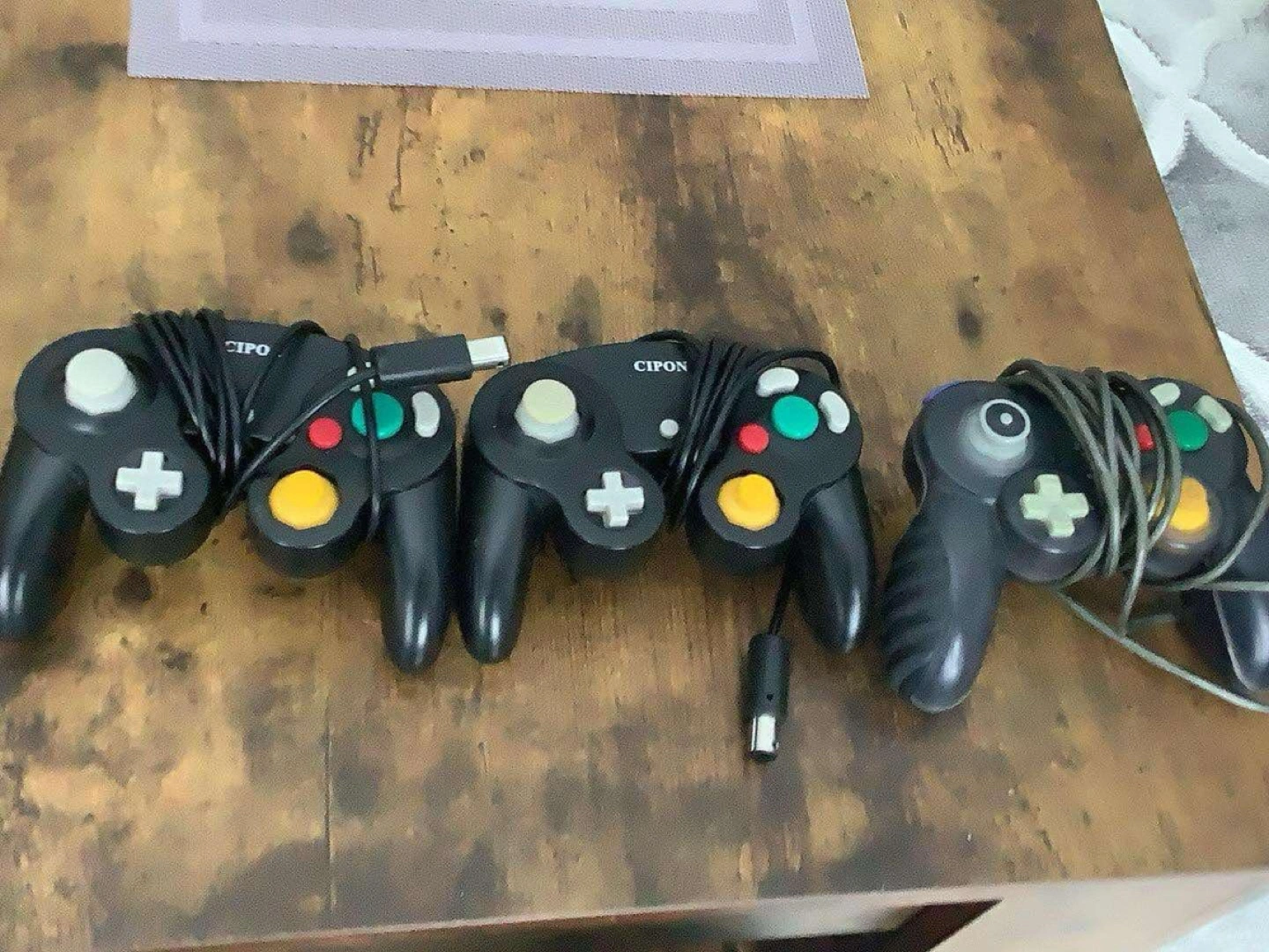 Three black wireless GameCube controllers. CIPON brand. Includes cords.