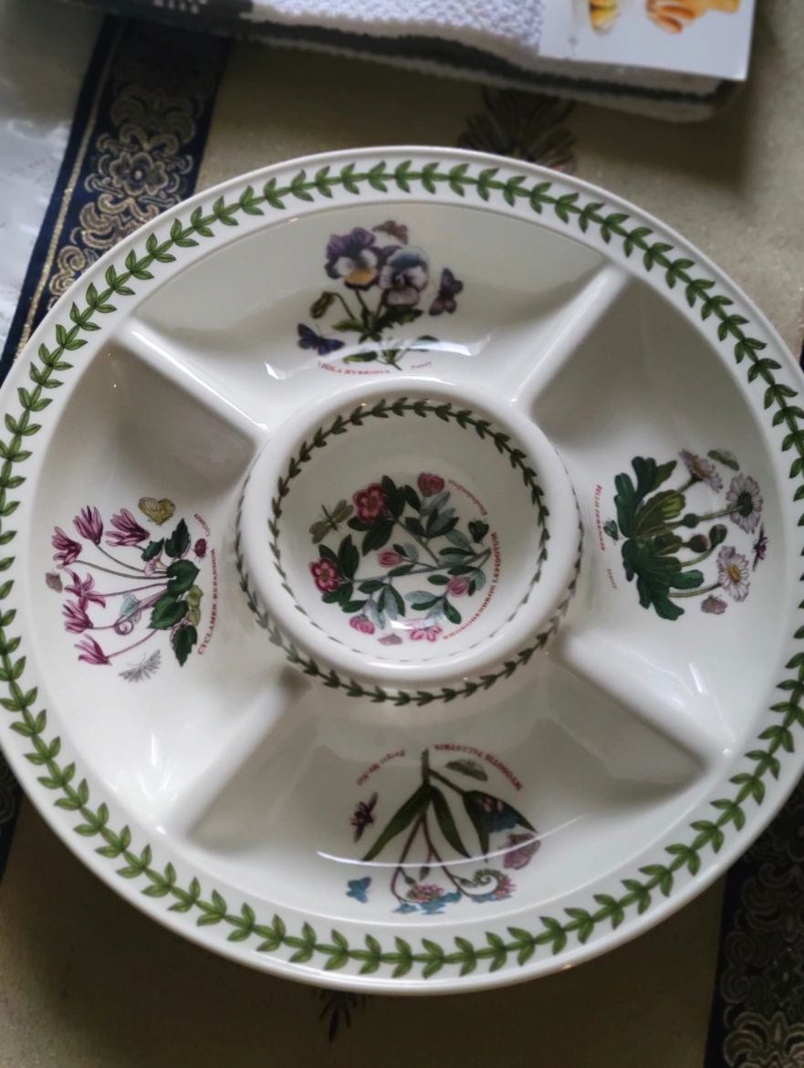 Five-section serving platter. Features botanical illustrations. Centre well for dips or sauces. Green leaf border. Purchased from Homsense