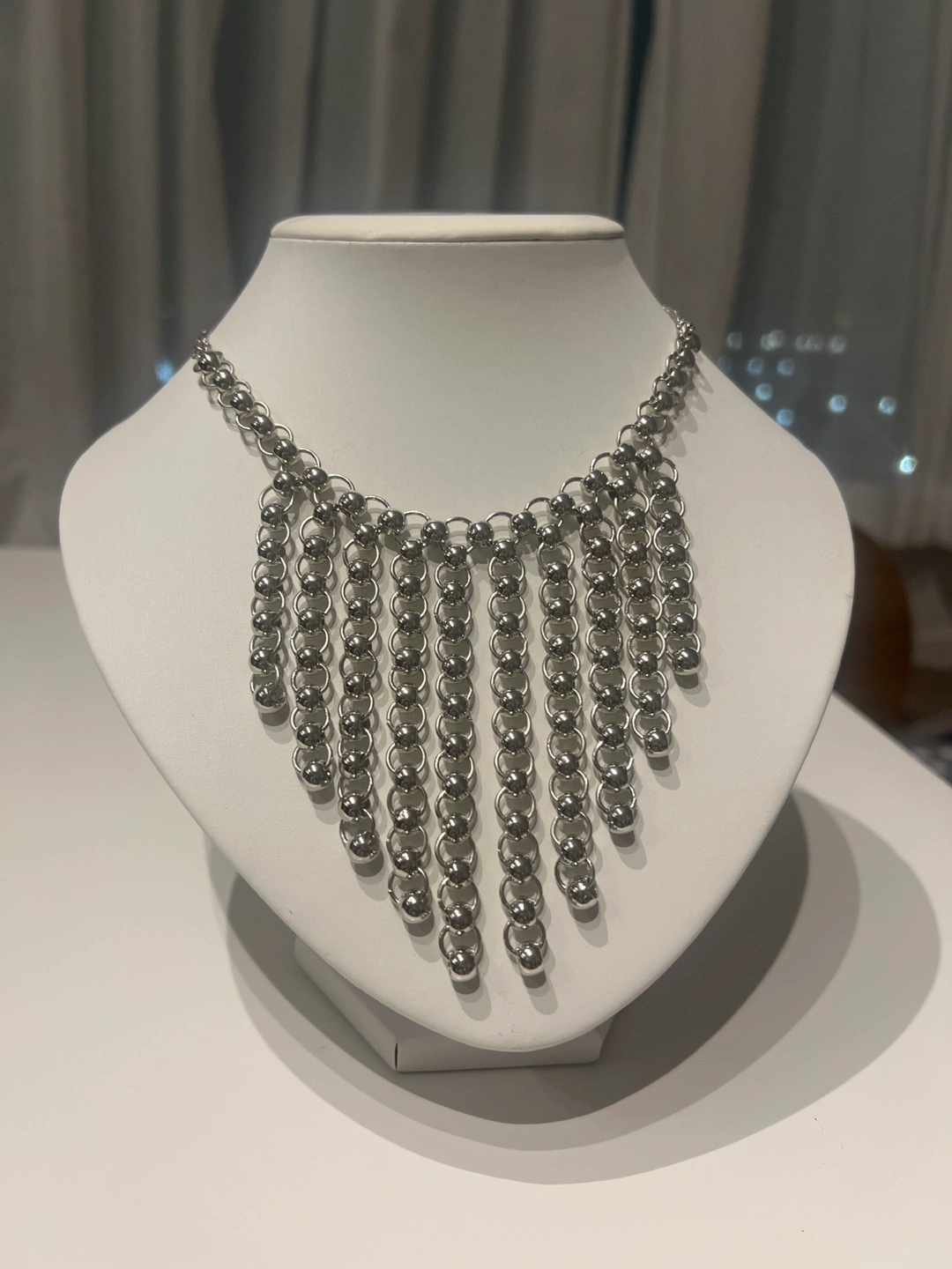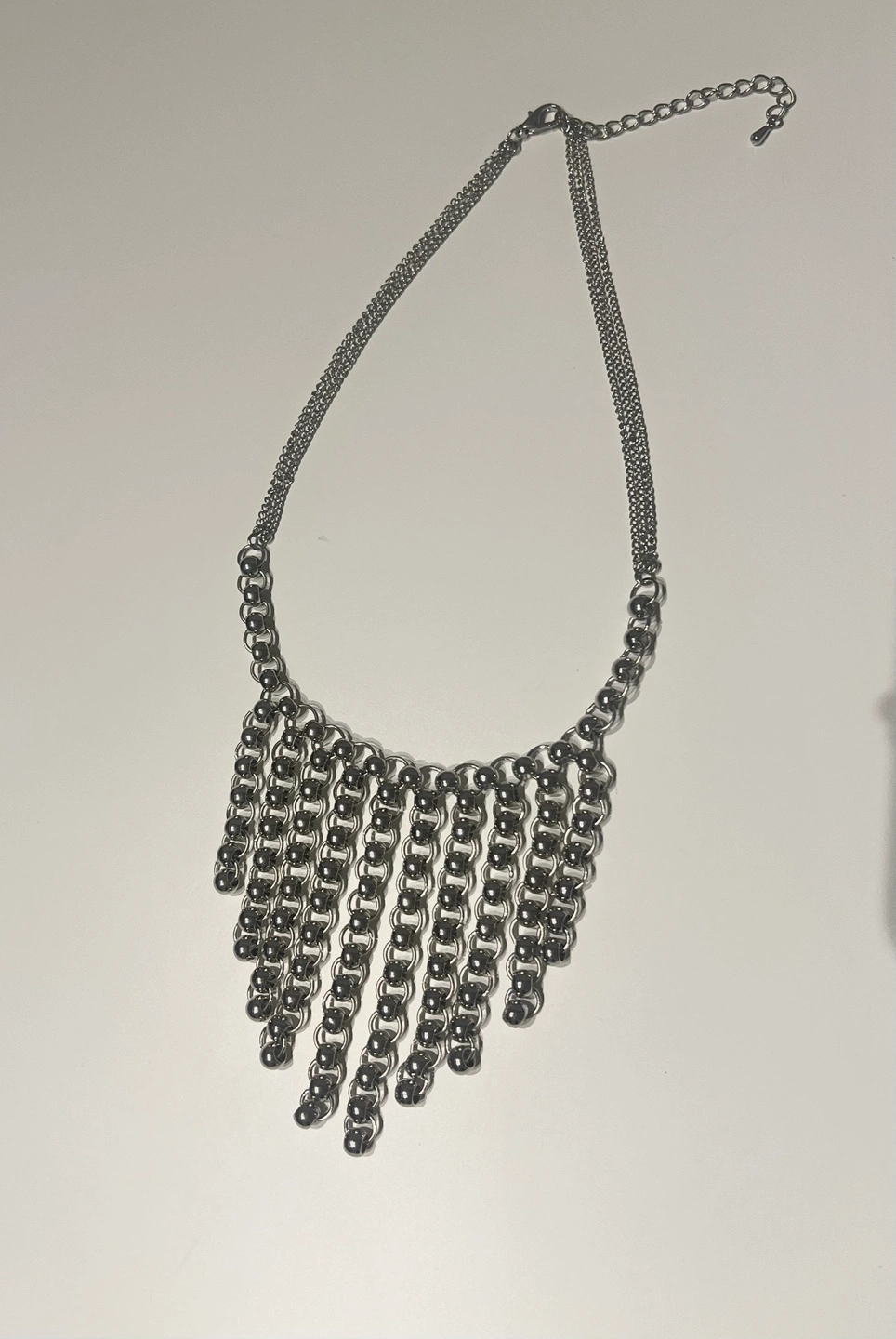 Unique silver necklace. Features a chain design with dangling beaded strands. Great statement piece. Looks great dressed up or down.