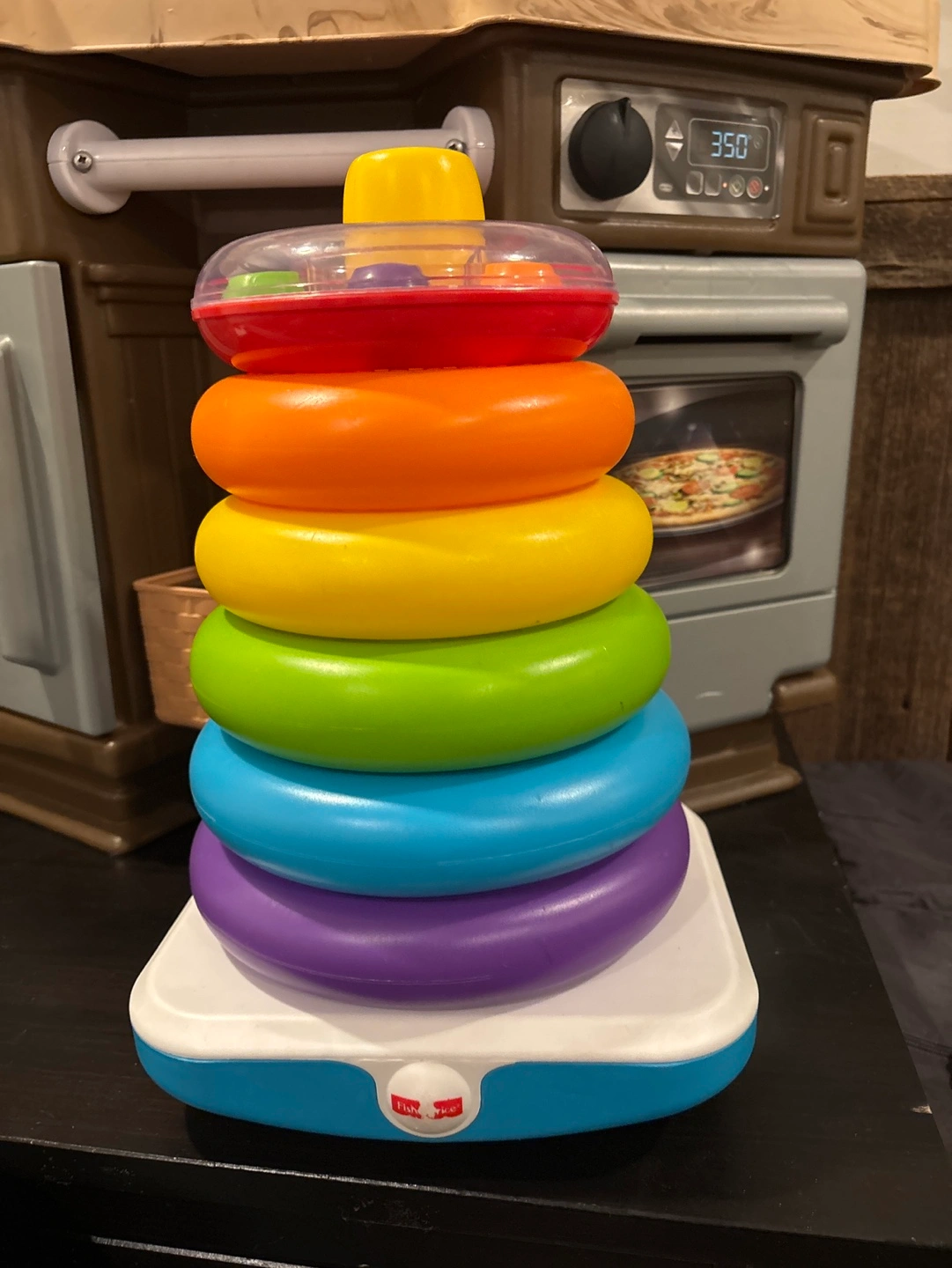 Rainbow coloured stacking rings. Fun for babies and toddlers. Develops fine motor skills and colour recognition. Includes a base.
