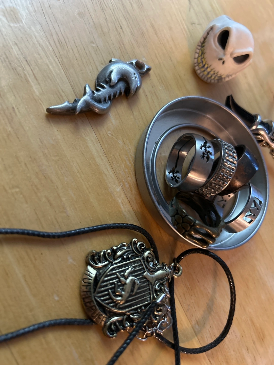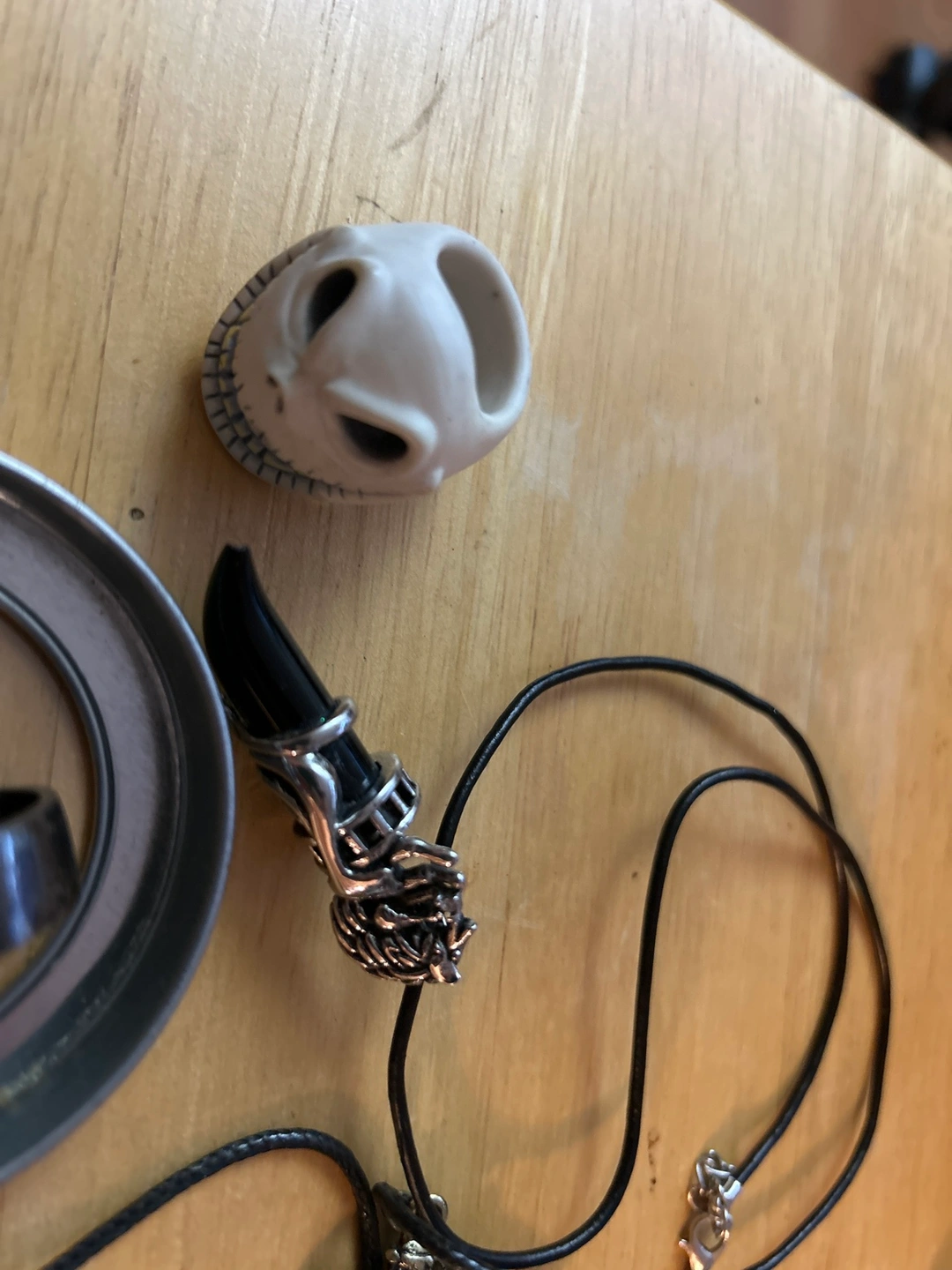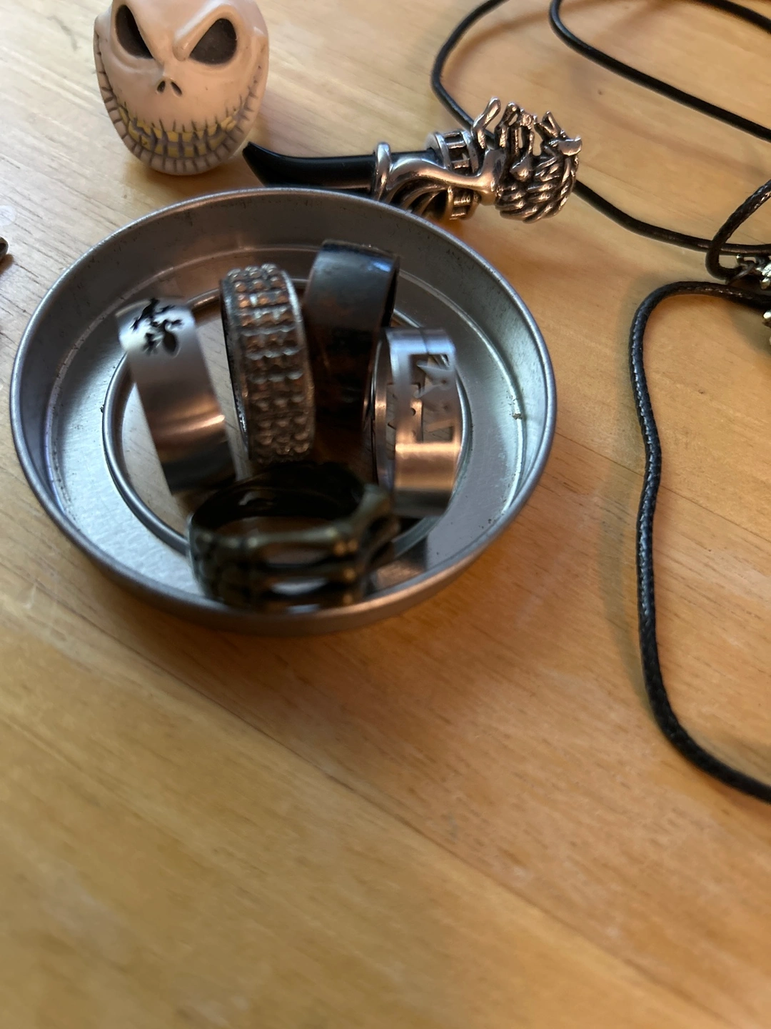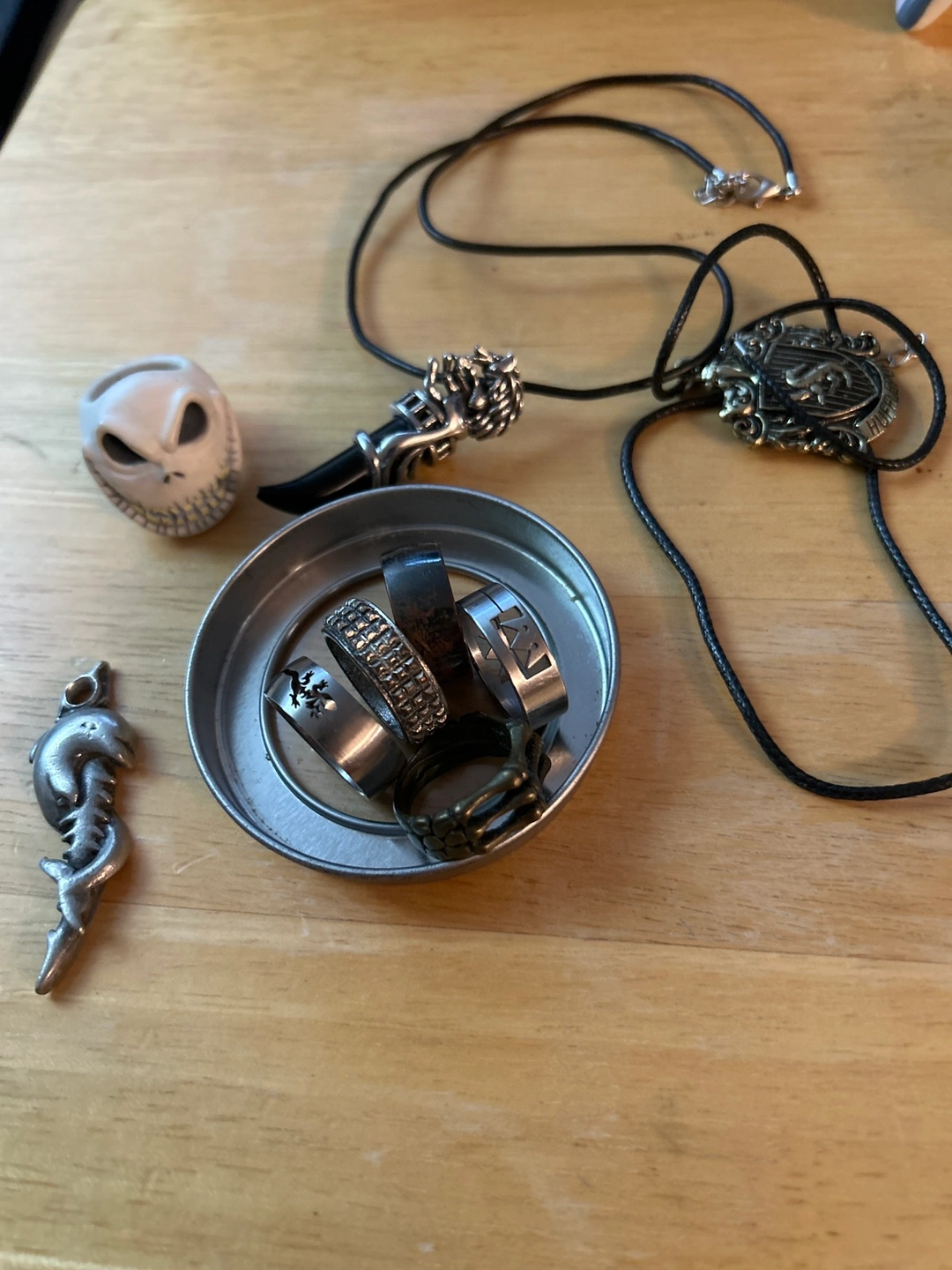 Bulk lot of assorted jewelry. Includes two necklaces, several rings, and two pendants. One pendant features a Jack Skellington figurine. Mostly silver-toned metal. Great for Halloween or gothic fashion.