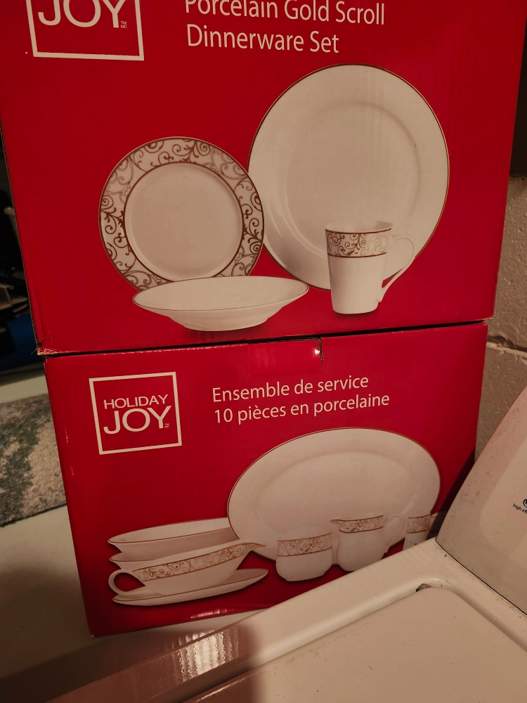 New in box. Porcelain dinnerware set. Gold scroll design. Set is dishes and one set is serving ware. $25 each set