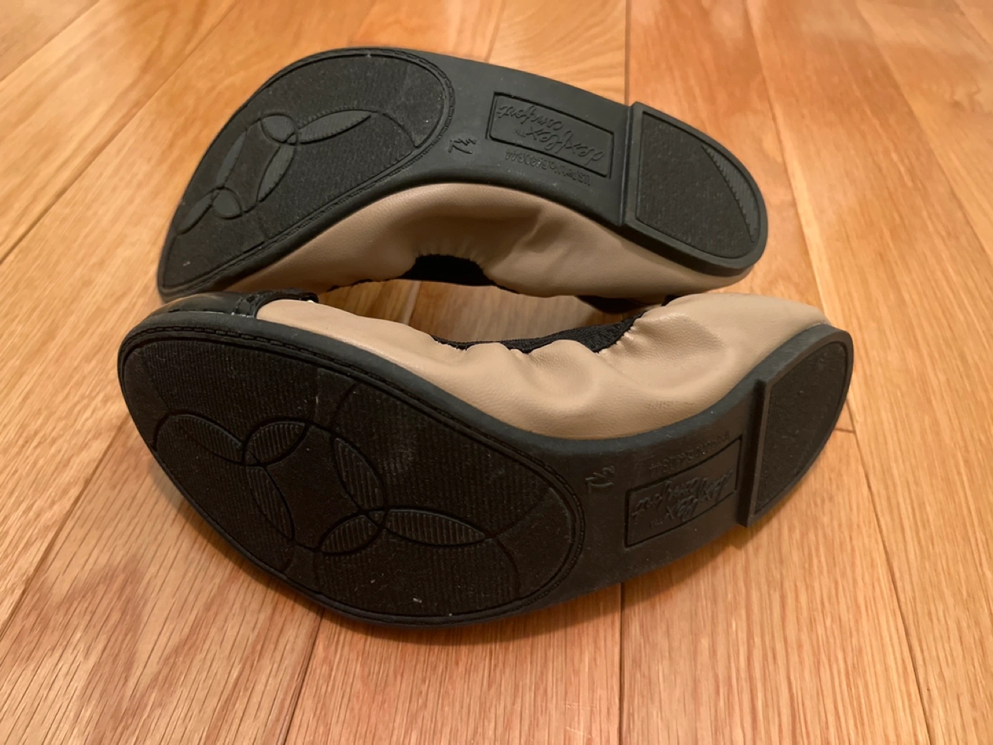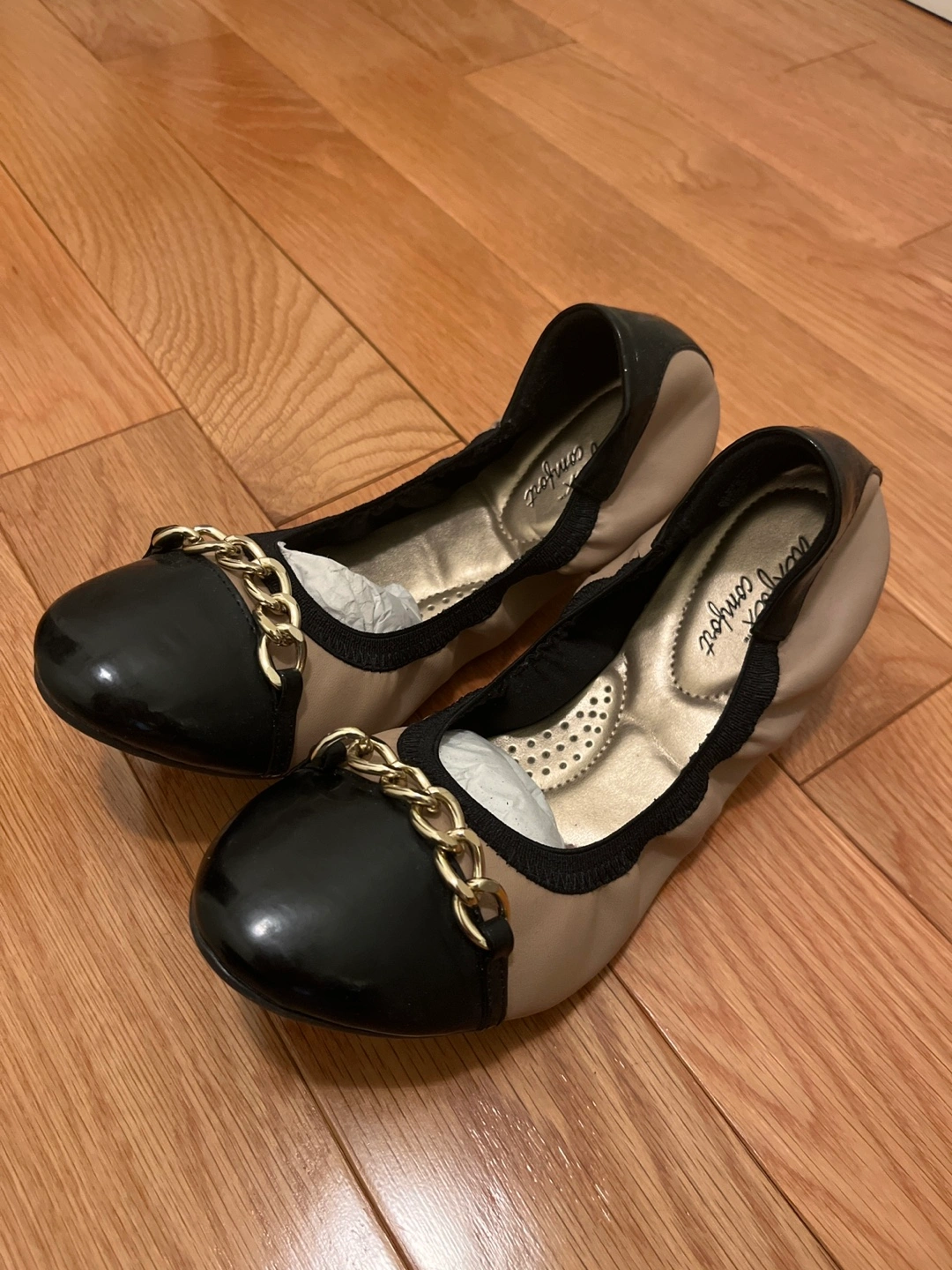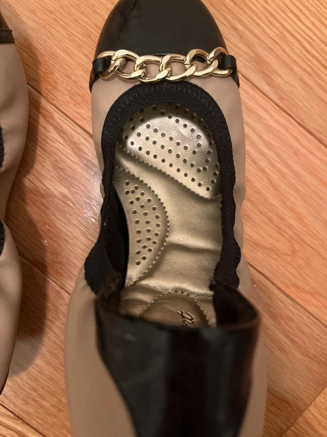 Women's ballet flats. Beige and black. Gold chain accent. Size 7.5. Never worn. Does not come with the box. As shown in the picture. Meet ups Main Street Station or downtown Toronto Evening or Weekend pickups
