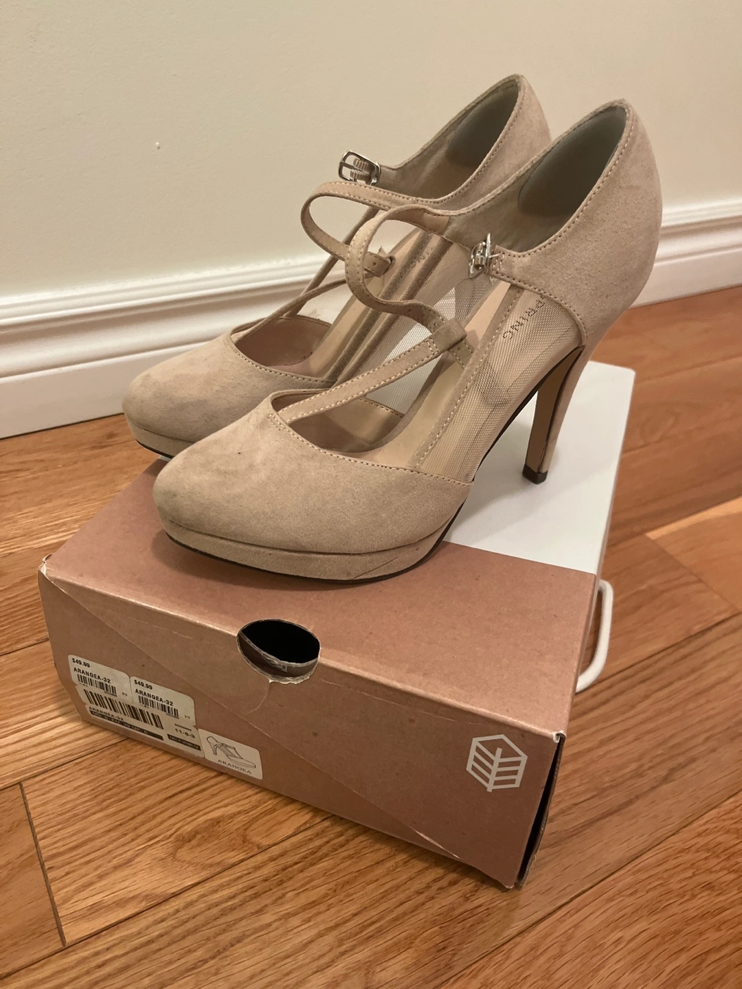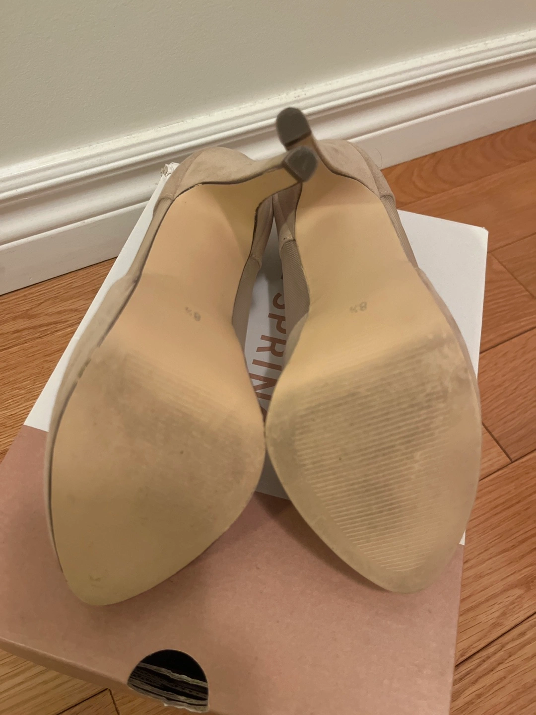 Beige suede heels in Size 8. Worn once. Features a T-strap design and stiletto heel. Comes in the original box. Purchased at Call It Spring for $50.