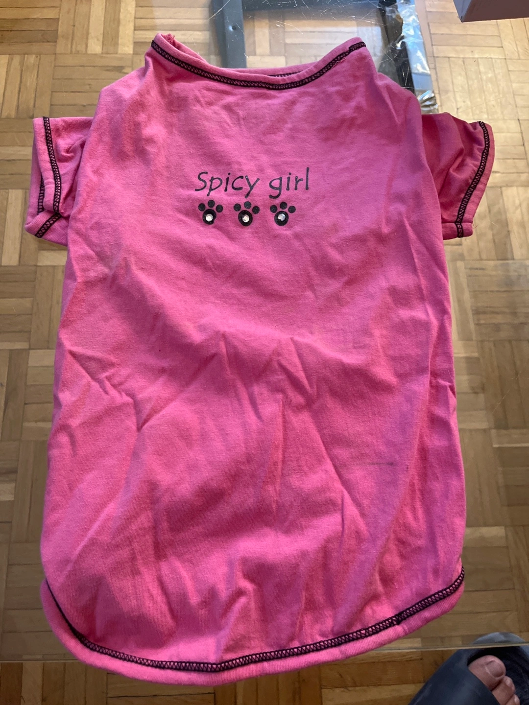 Spicy Girl Pink dog t-shirt. Features rhinestones. 100% cotton. Machine washable. Size Medium. You can pick up by Carlton and Jarvis area