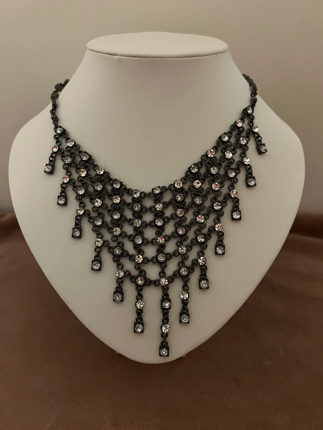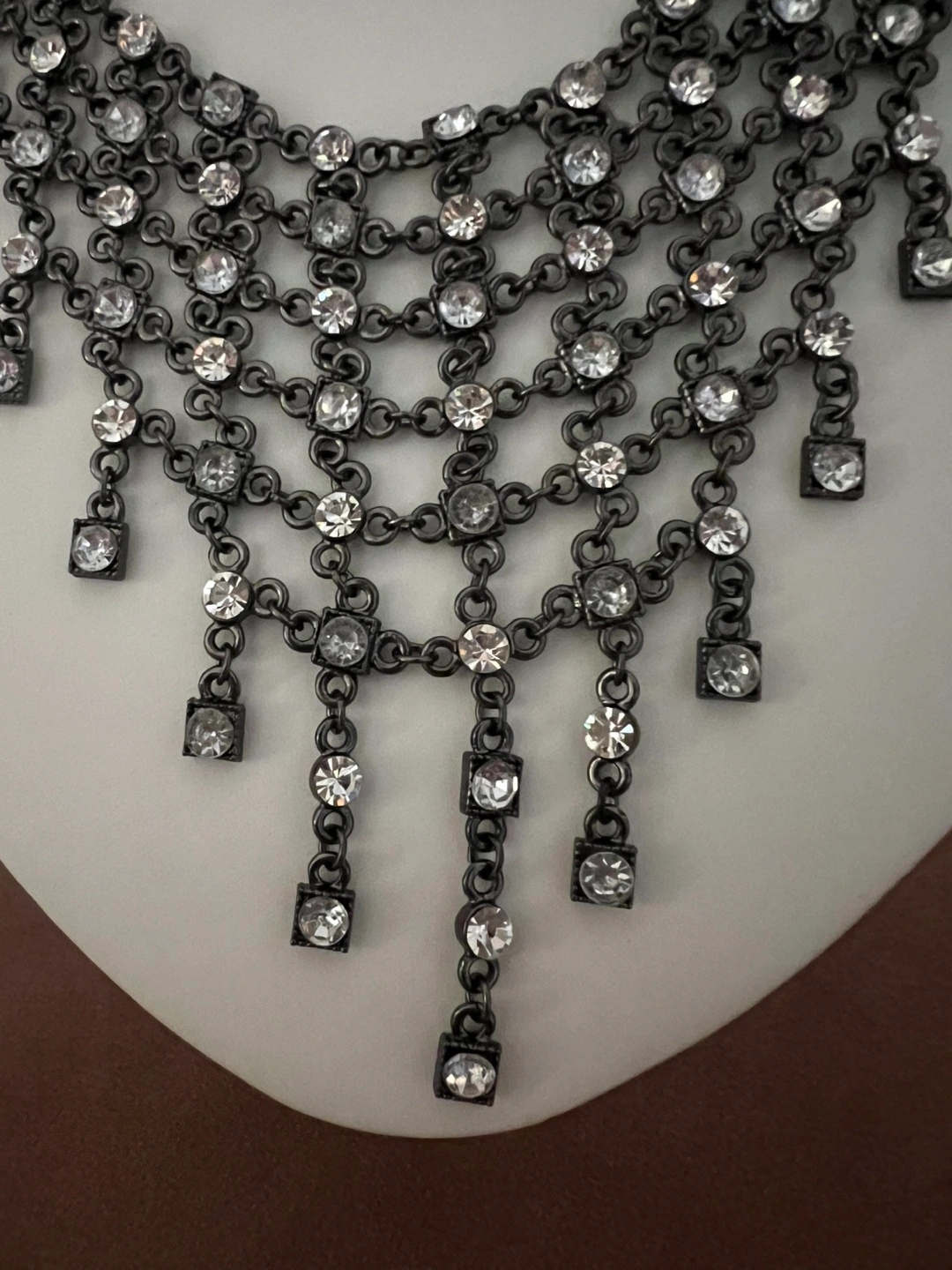 Beautiful dark grey metal necklace. Features cascading clear crystals. Elegant and eye-catching. Perfect for a special occasion.