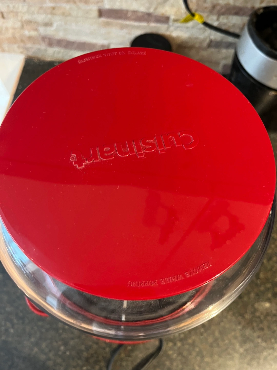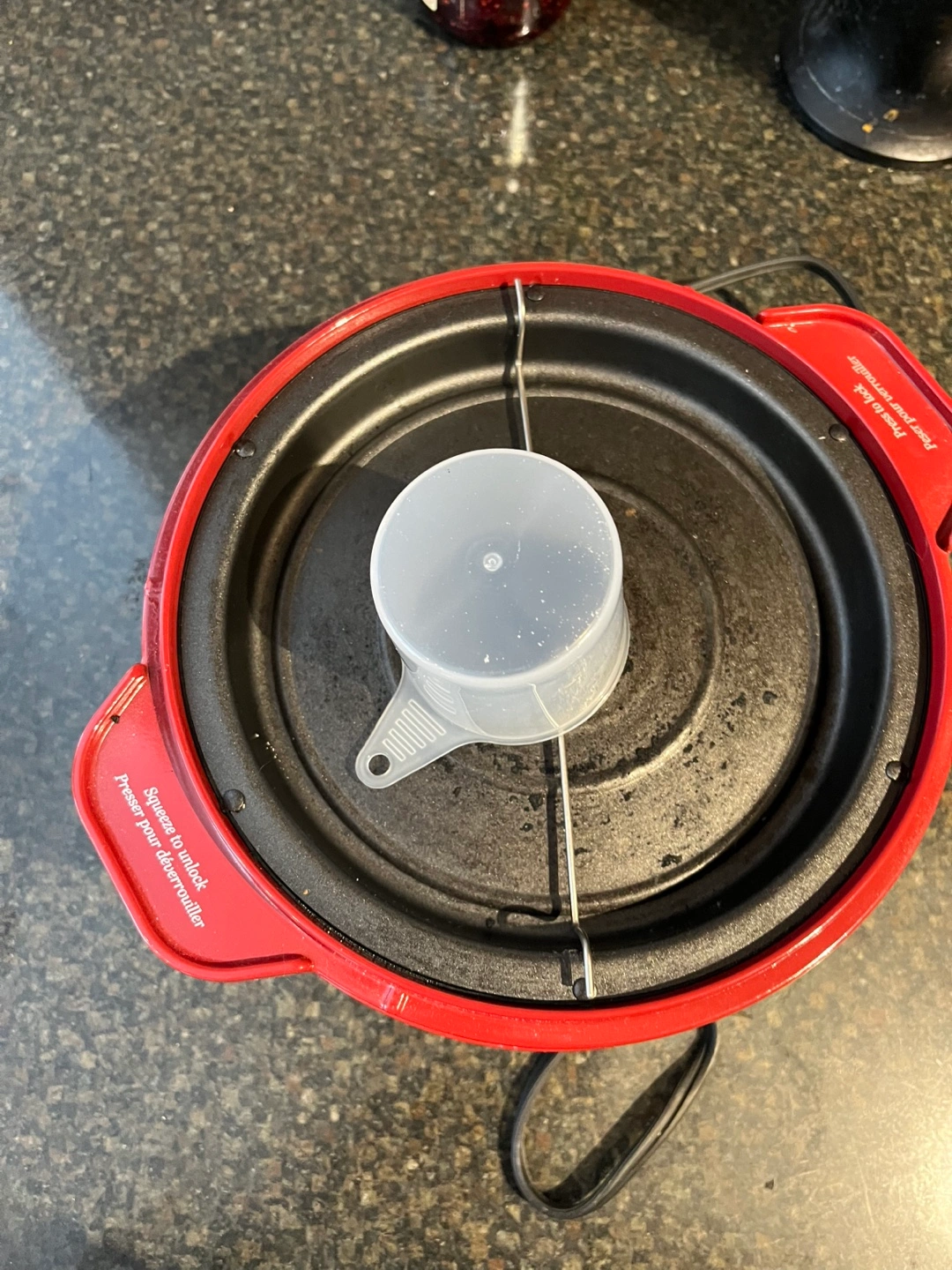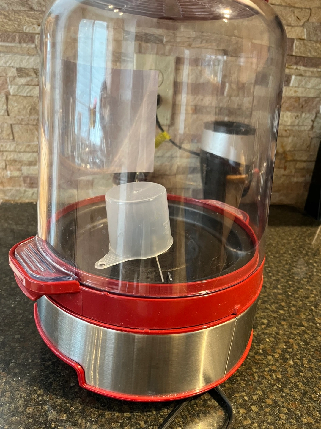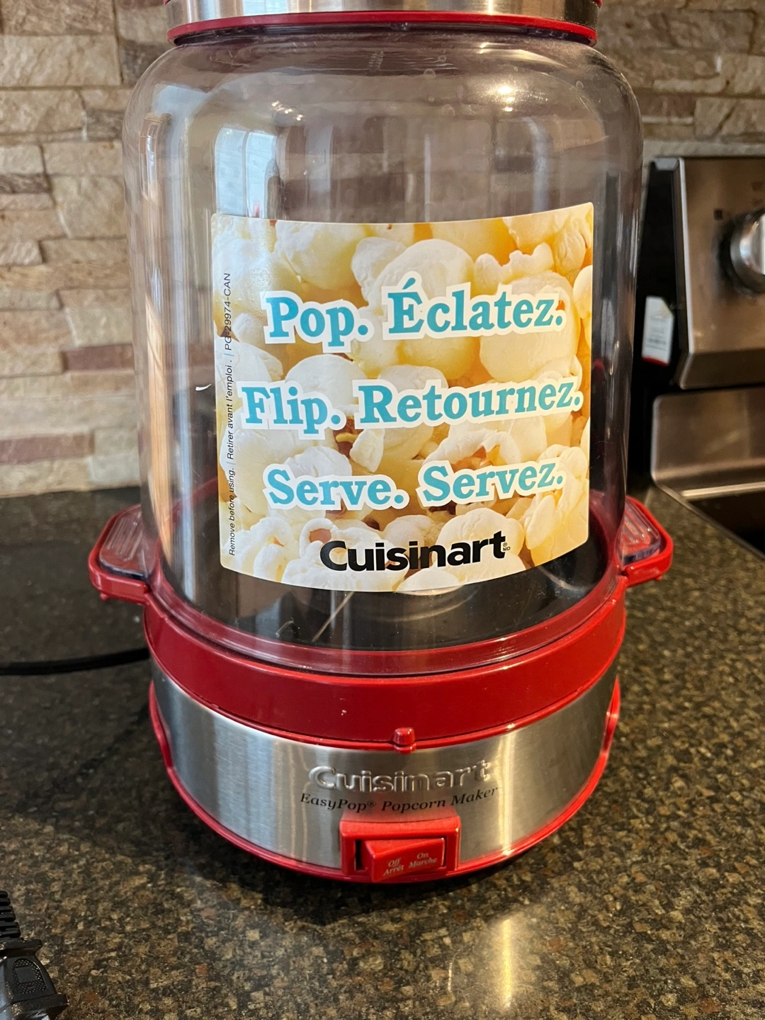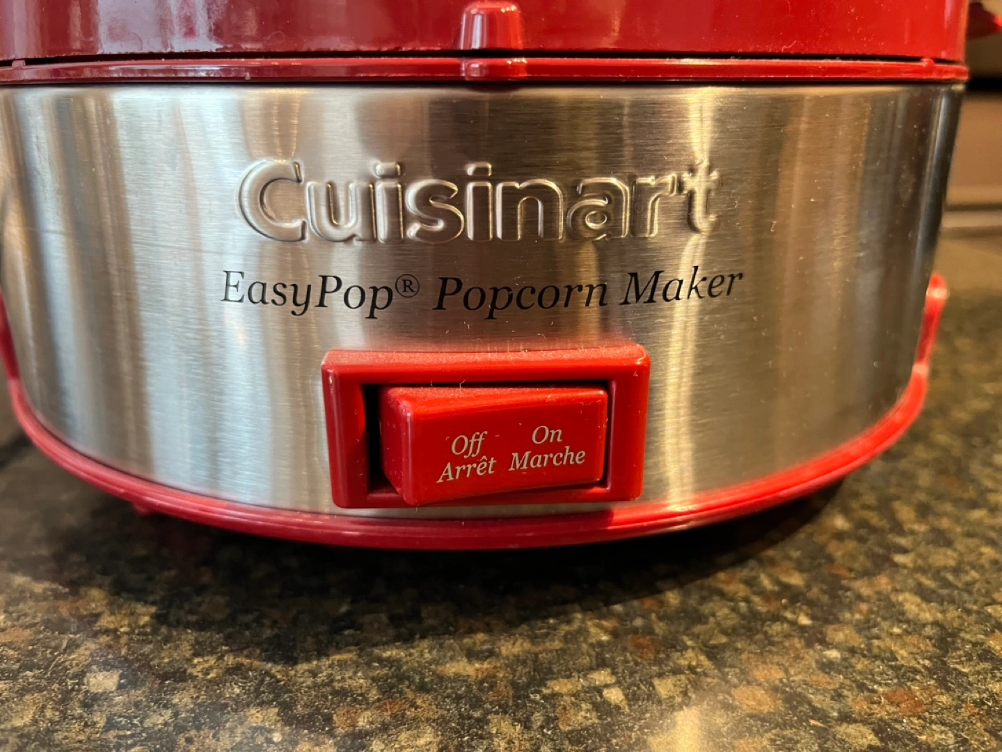 Red and stainless steel popcorn maker. Easy to use. Lid is Ofcourse clear plastic . Makes delicious popcorn. Includes measuring cup. Used only twice . I paid 65$ I prefer making it on stove top