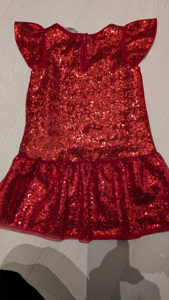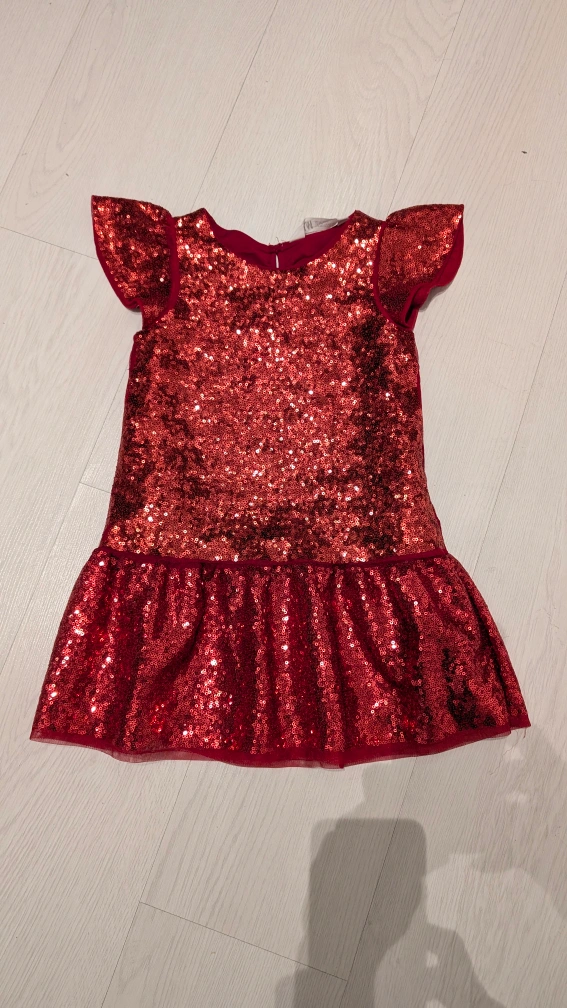 Adorable red sequin dress. Perfect for parties or special occasions. Flutter sleeves and a layered skirt. Size 4-5 years.