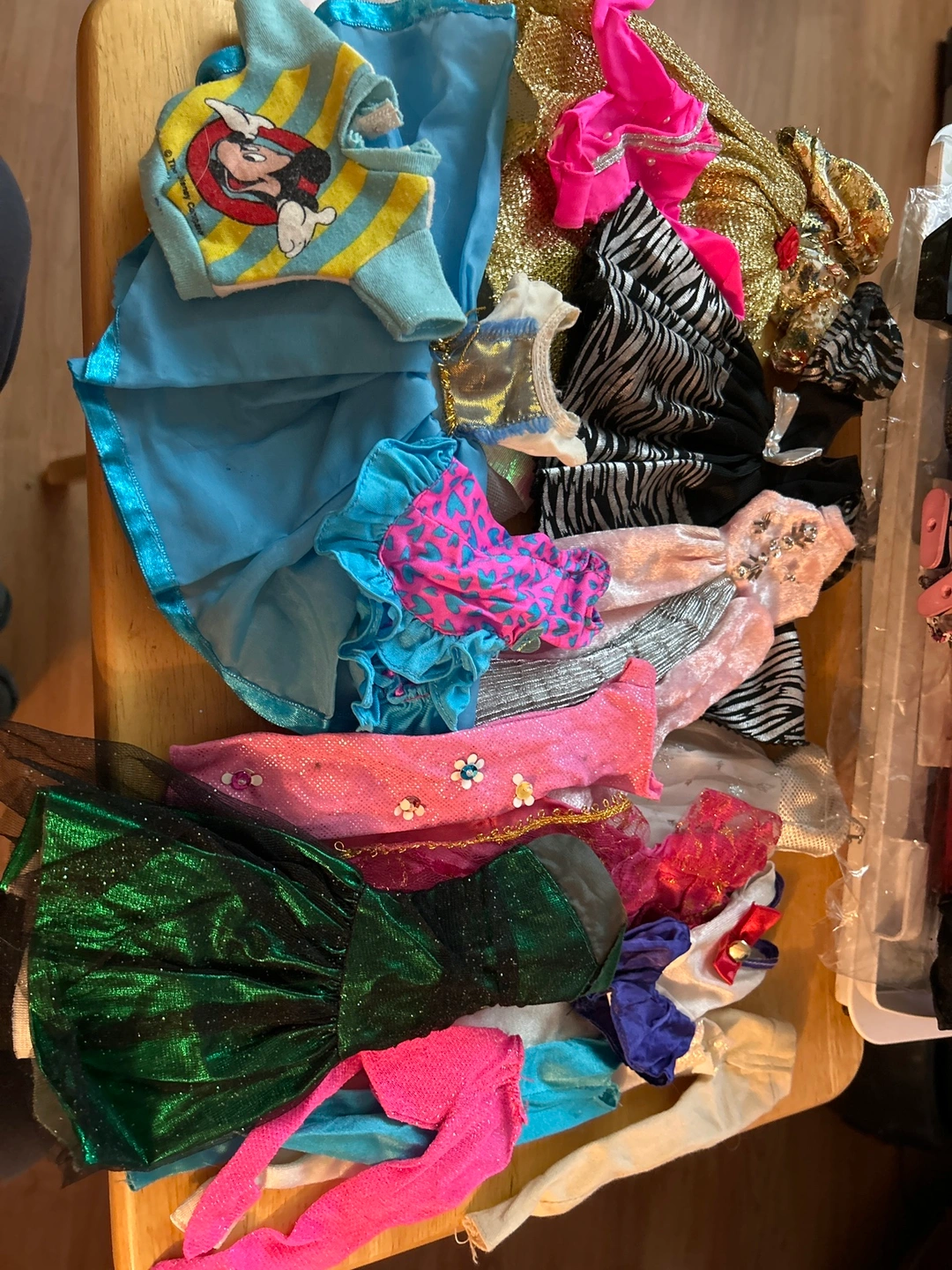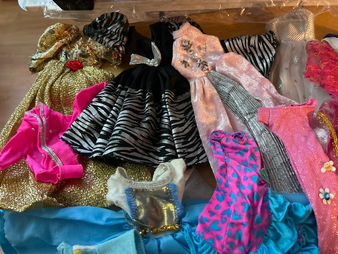 Assortment of pre-owned Barbie doll clothing. Various colours and styles. Includes dresses, tops, and skirts. Some show wear.