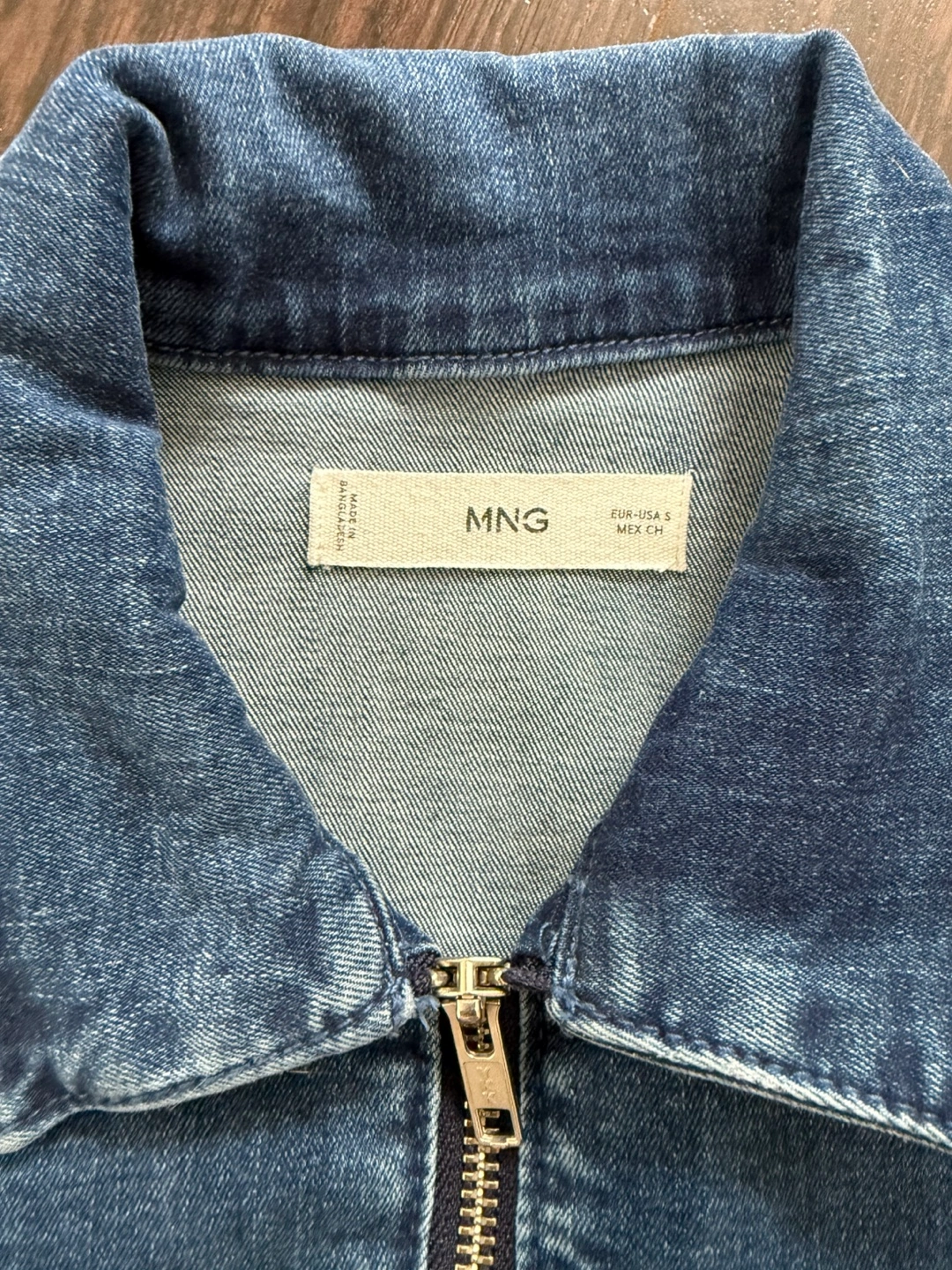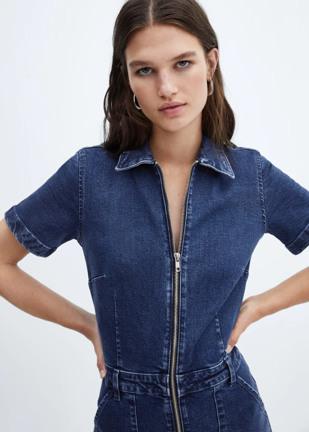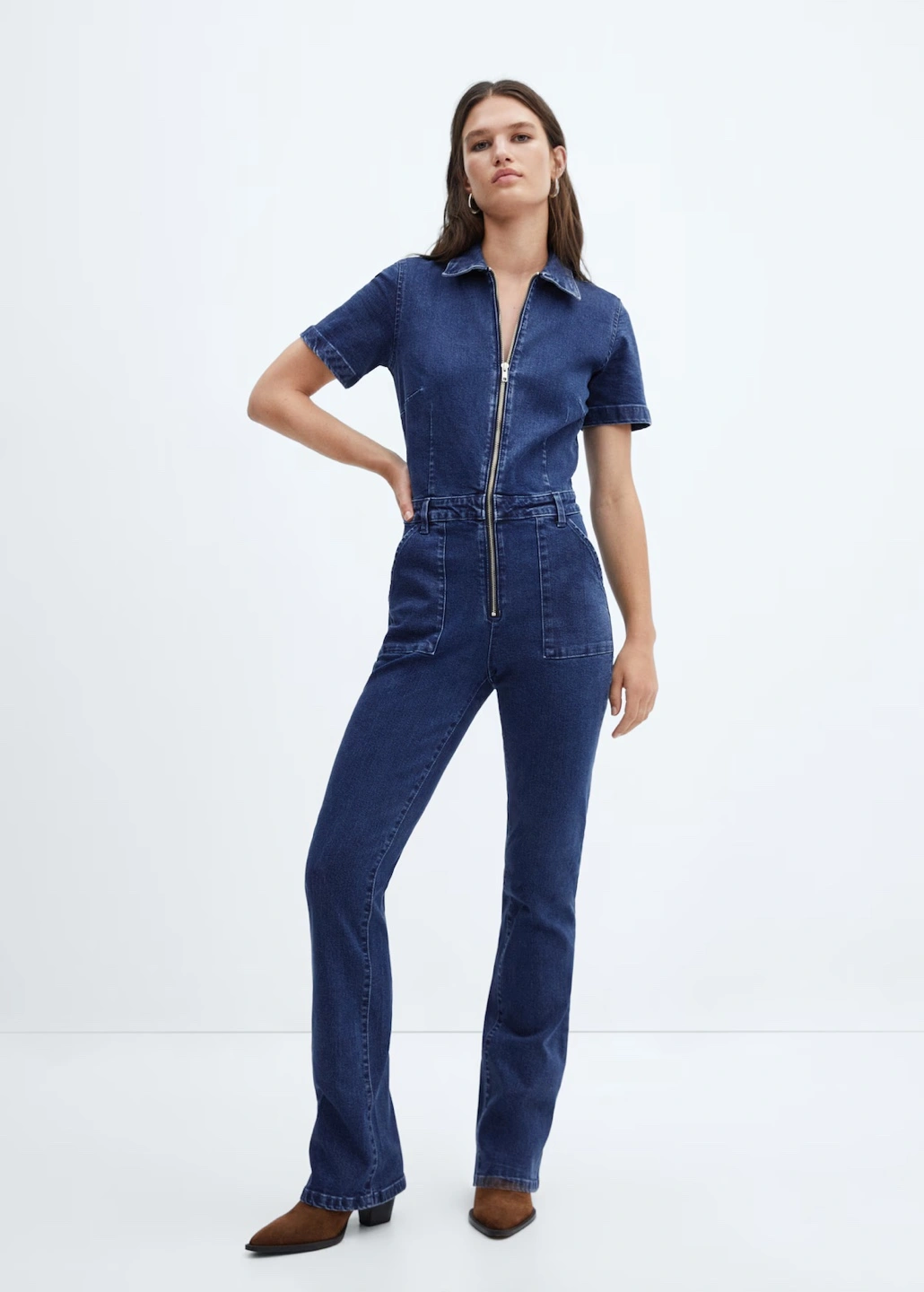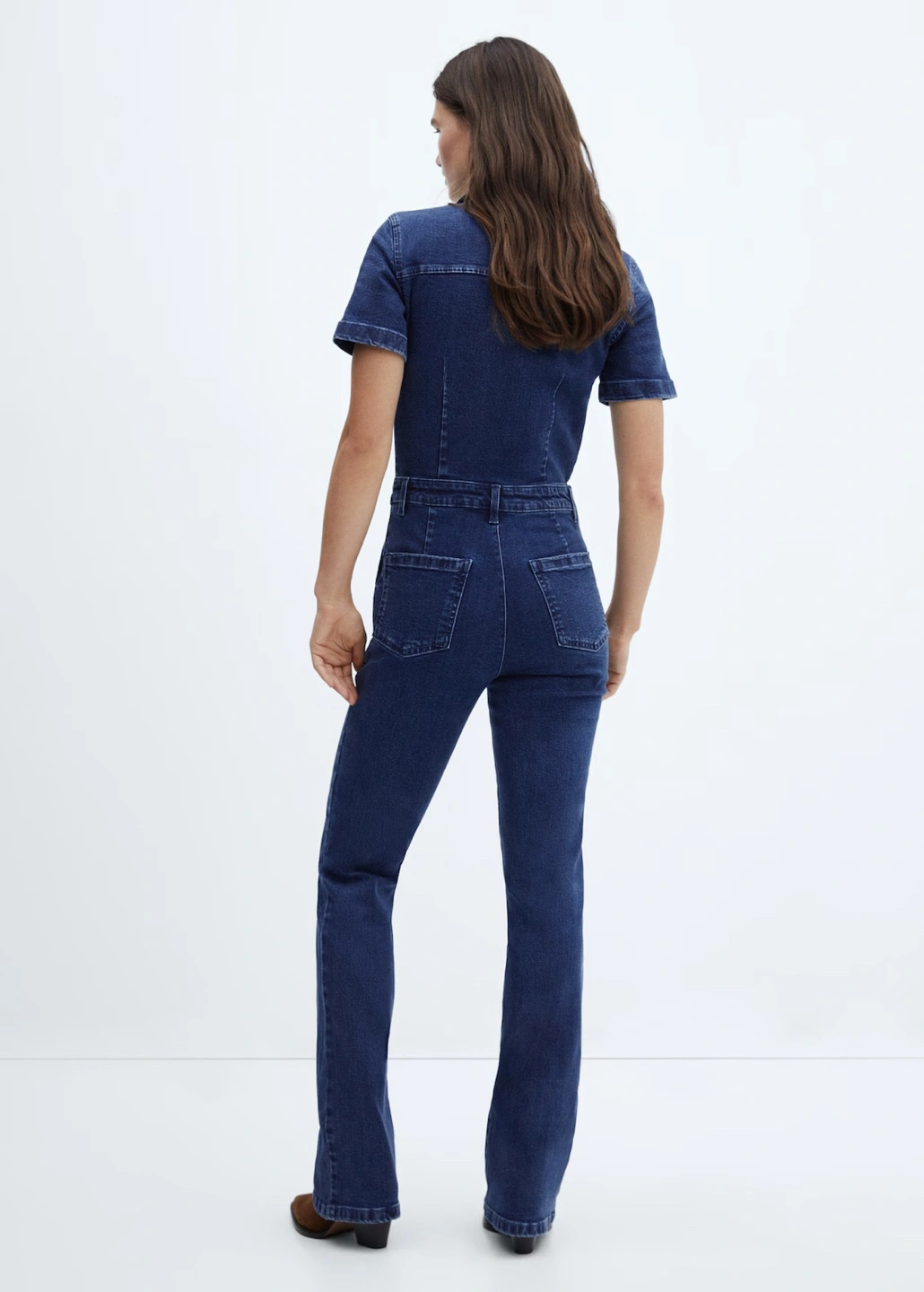Medium wash denim jumpsuit. Features a collared neckline, short sleeves, and a full-length zip closure. Bootcut leg. Pockets at hips. Excellent condition - only worn once (see last photo), Reason for selling: love everything about it except the torso is a bit too long on me. My height: 5’5” Size: Small Retail price: $139.99 (now sold out online)