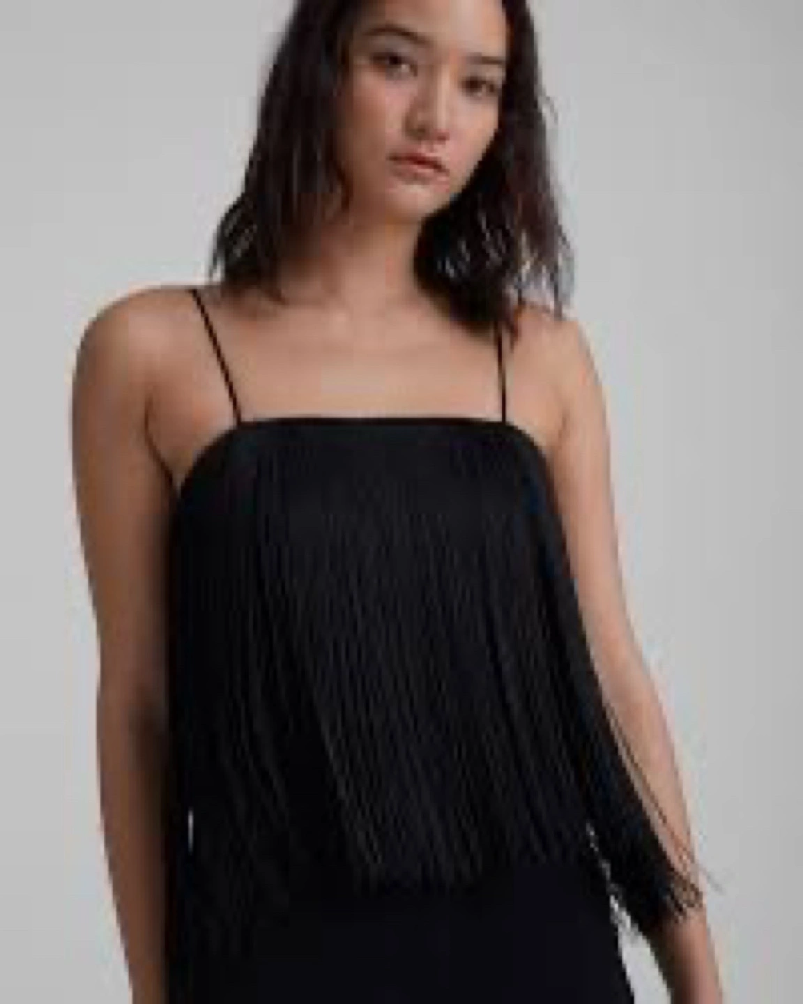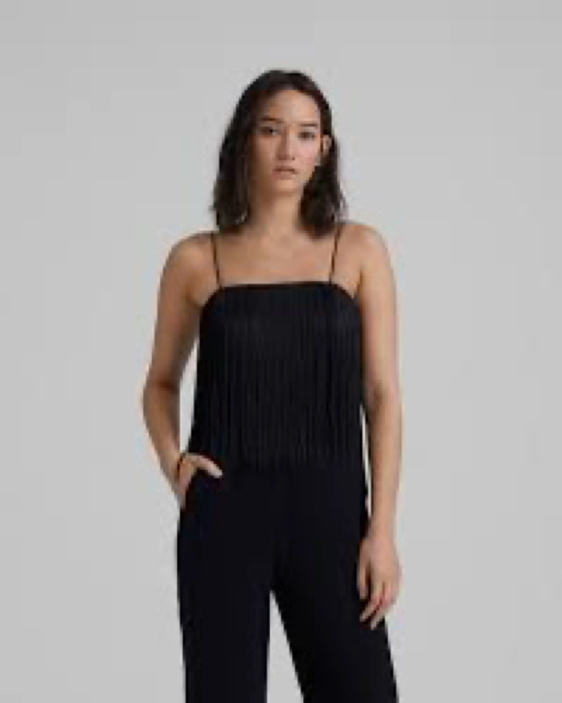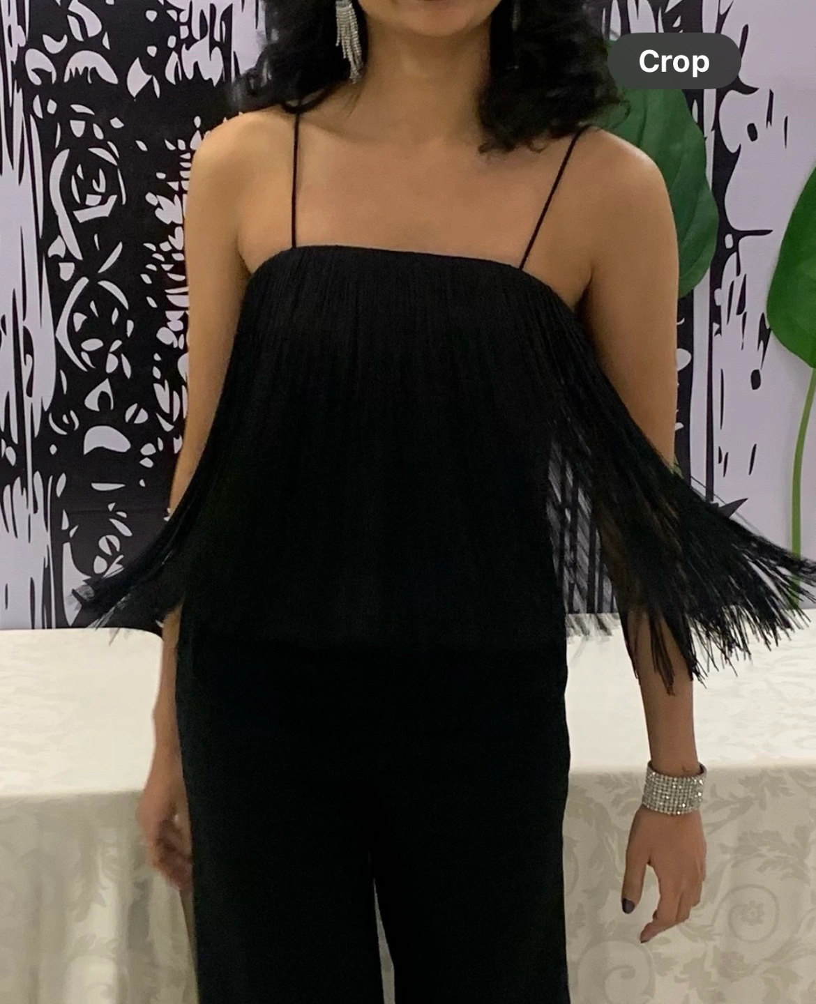 Elegant black jumpsuit. Features a fringed crop top, pockets and wide-leg trousers. Perfect for a special occasion. Reason for selling: Only worn once to a wedding, not sure I’ll wear it again but it’s definitely a classic. Got lots of compliments. Retail price: $199