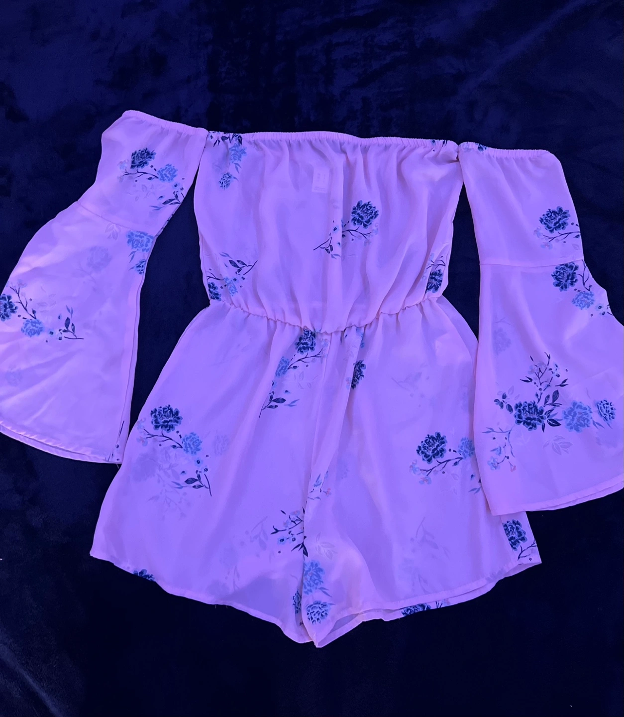 Lightweight pink jumpsuit. Off-the-shoulder style. Features bell sleeves and a floral print. Romper style.