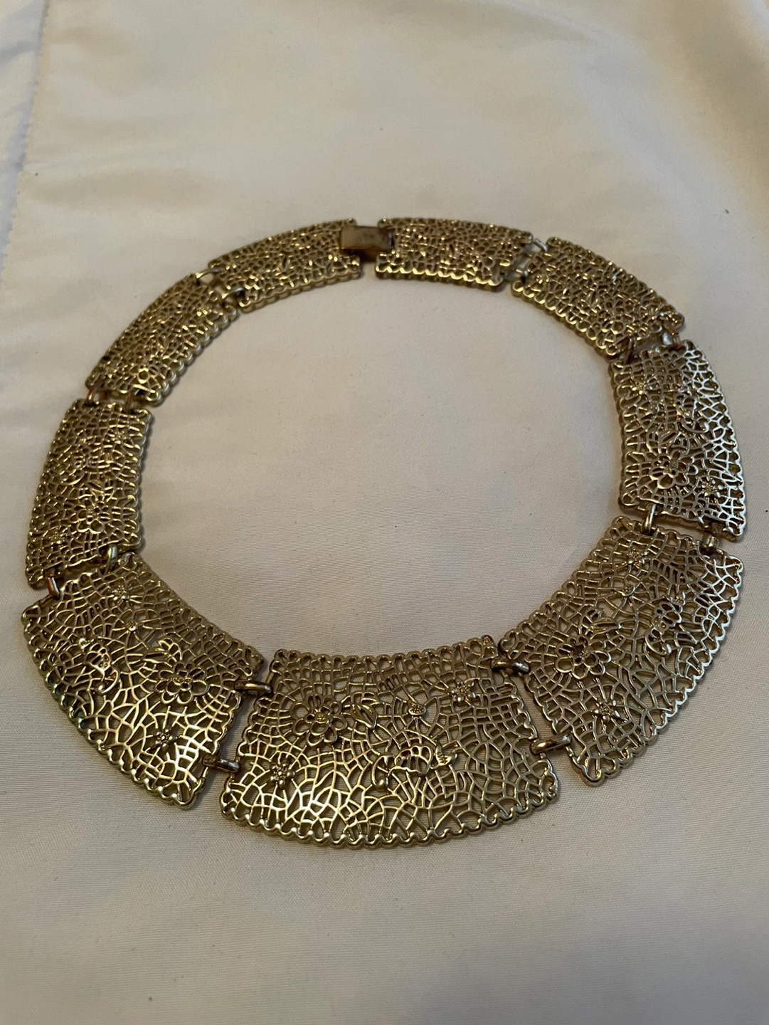 Beautiful gold-tone necklace. Features a filigree design. Rectangular links. Clasp closure. Preloved but still has life to give.