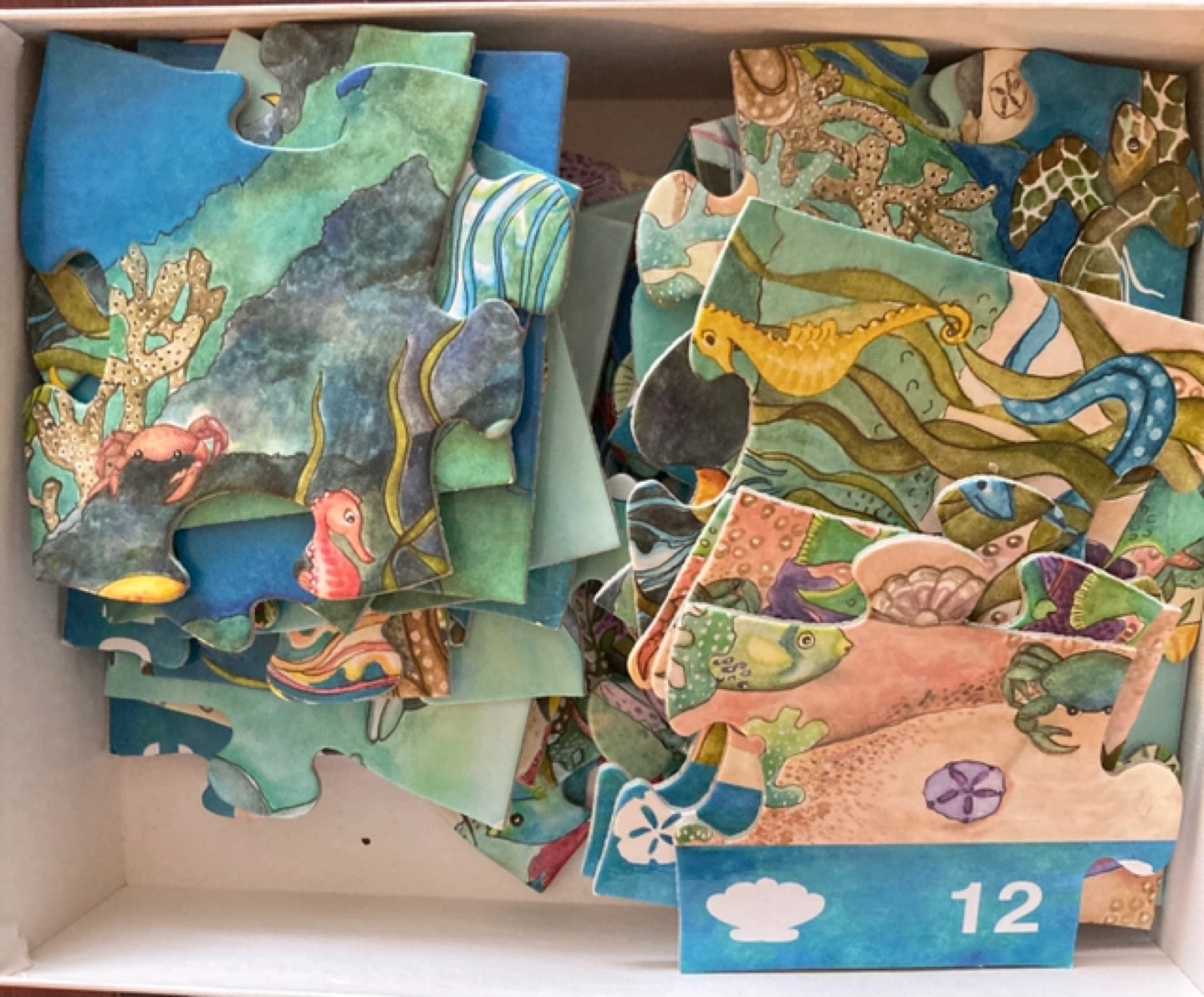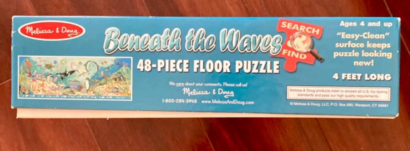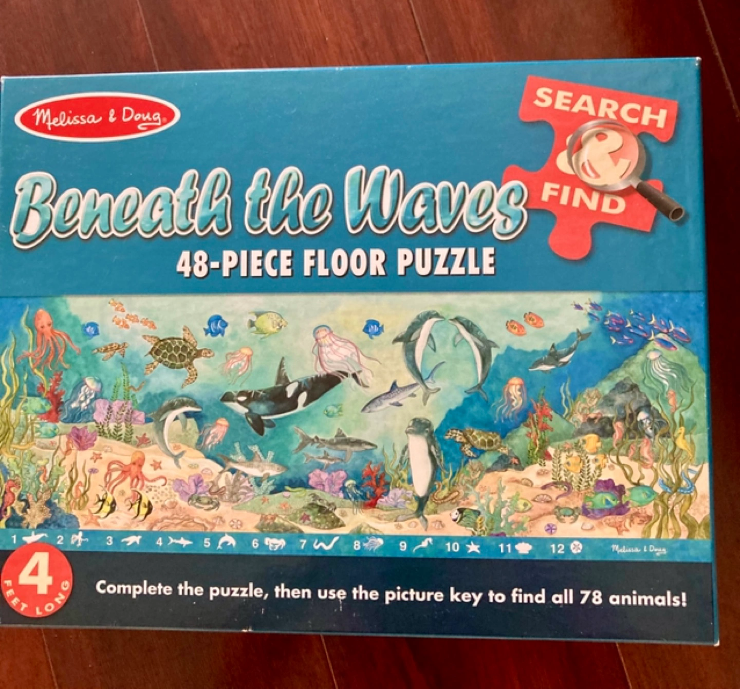 48-piece floor puzzle. Features ocean animals. Search and find 78 animals. Four feet long. Ages 4 and up. Easy-clean surface. High quality product will last for years. Big enough piece so no safety concerns.