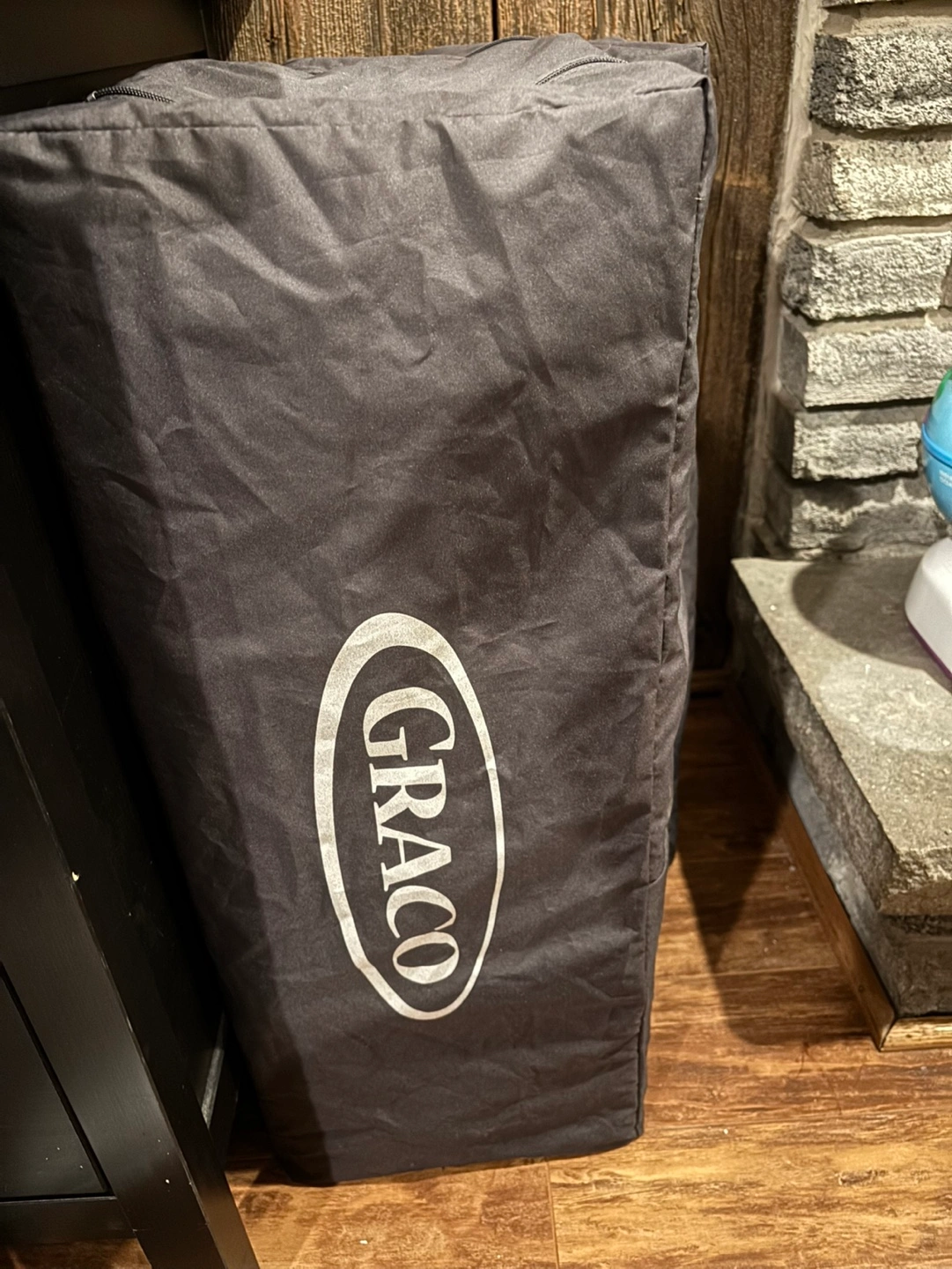 Grey fabric storage bag. Zipper closure. Excellent for storing and protecting a Graco Pack 'n Play.