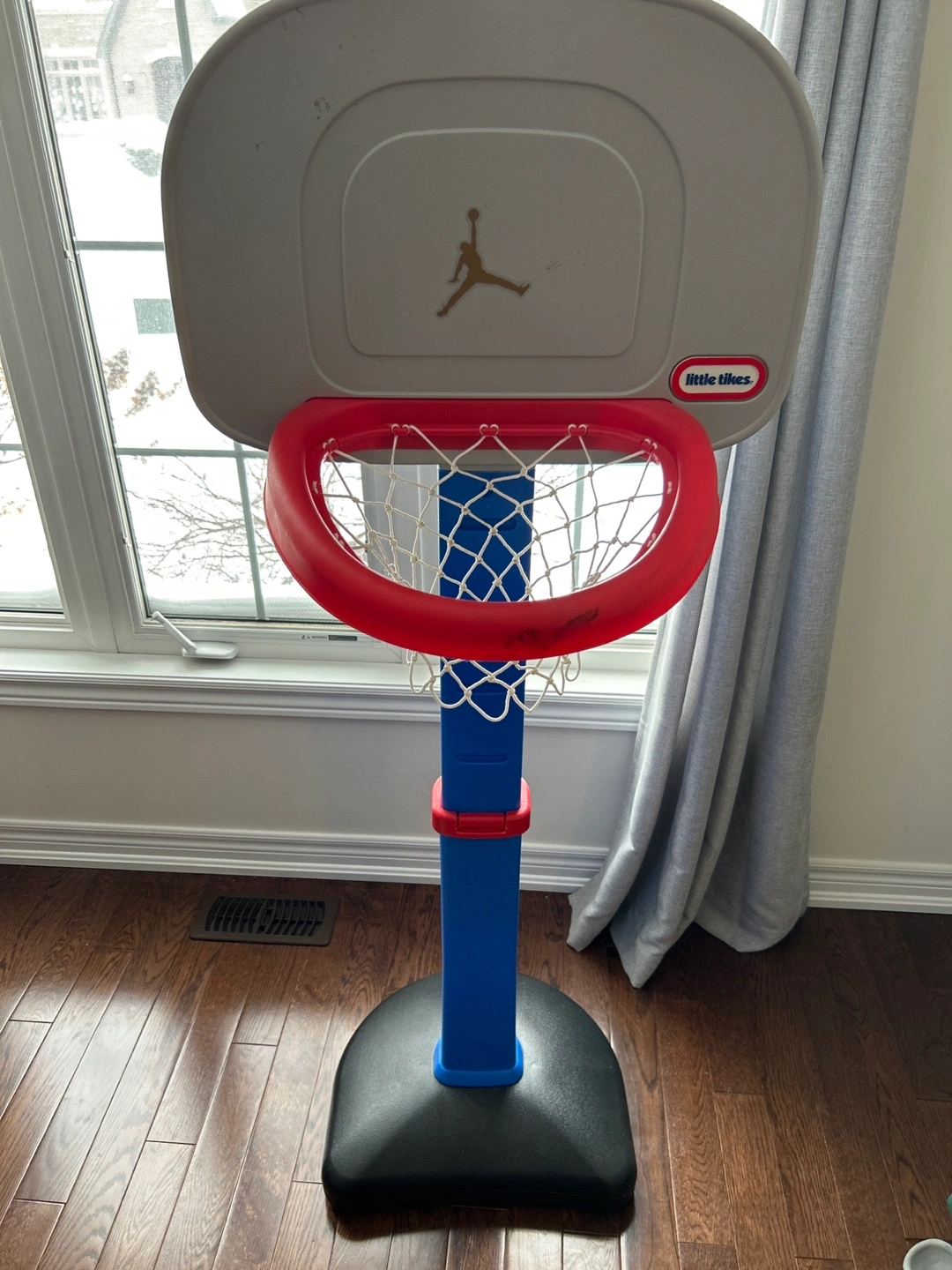 Miniature basketball hoop. Features a red and blue base, and a grey backboard. Includes net. Suitable for toddlers.