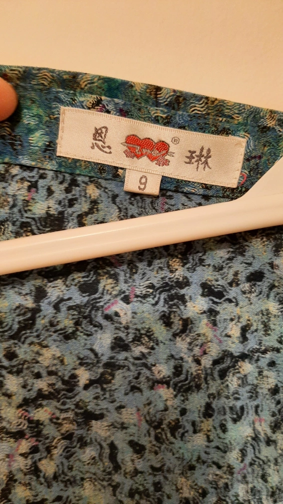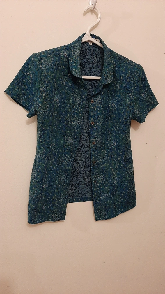 Short-sleeved collared blouse. Teal and green floral pattern. 65% polyester, 35% viscose. Made in China. Size 9.