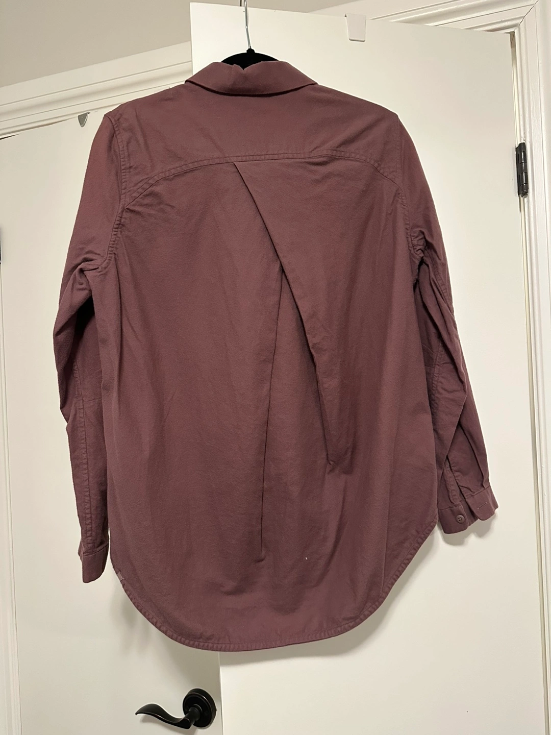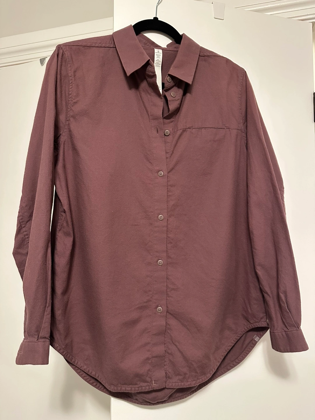 Women's long-sleeve button-down shirt. Size 8. Burgundy colour. Relaxed fit. Rounded hem.