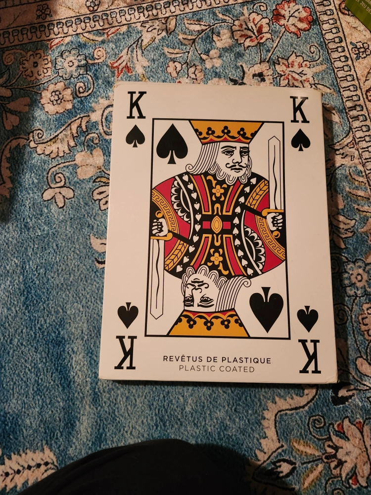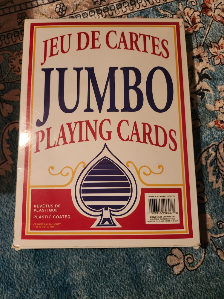 Large-sized playing cards. Plastic coated for durability. New in box.