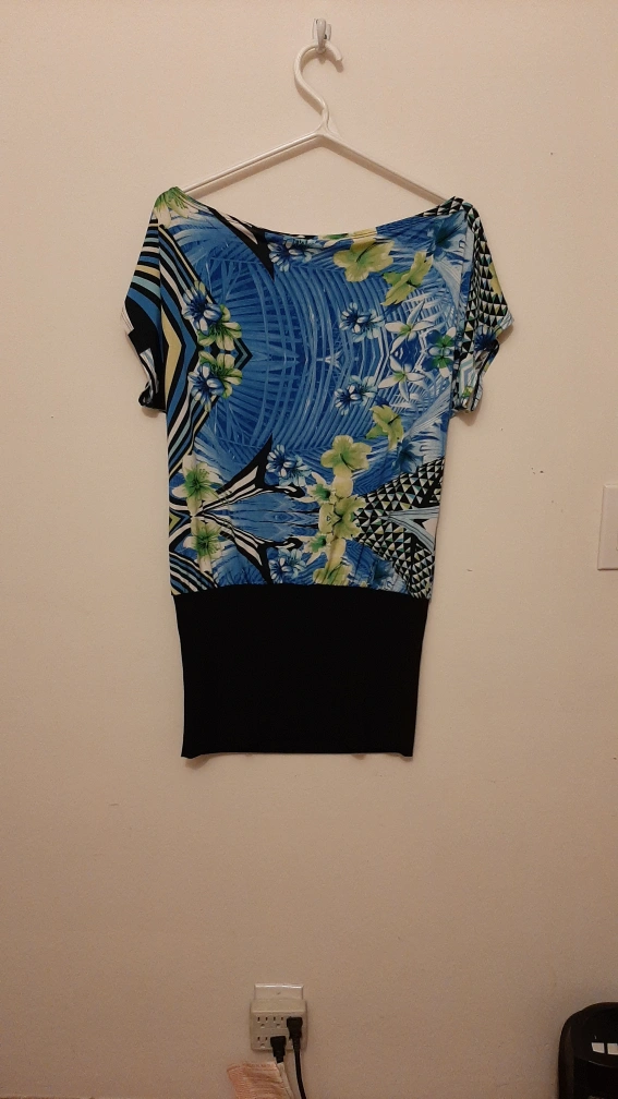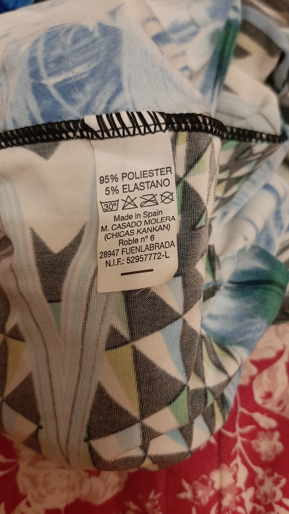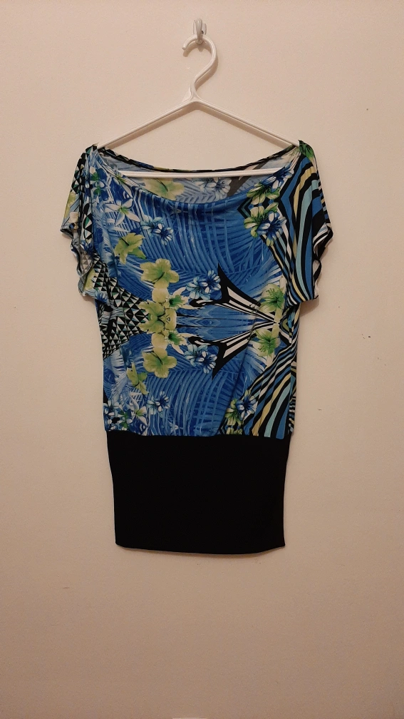 Short sleeve, boat neck, printed top. Black band at the bottom. 95% polyester, 5% elastane. Made in Spain.