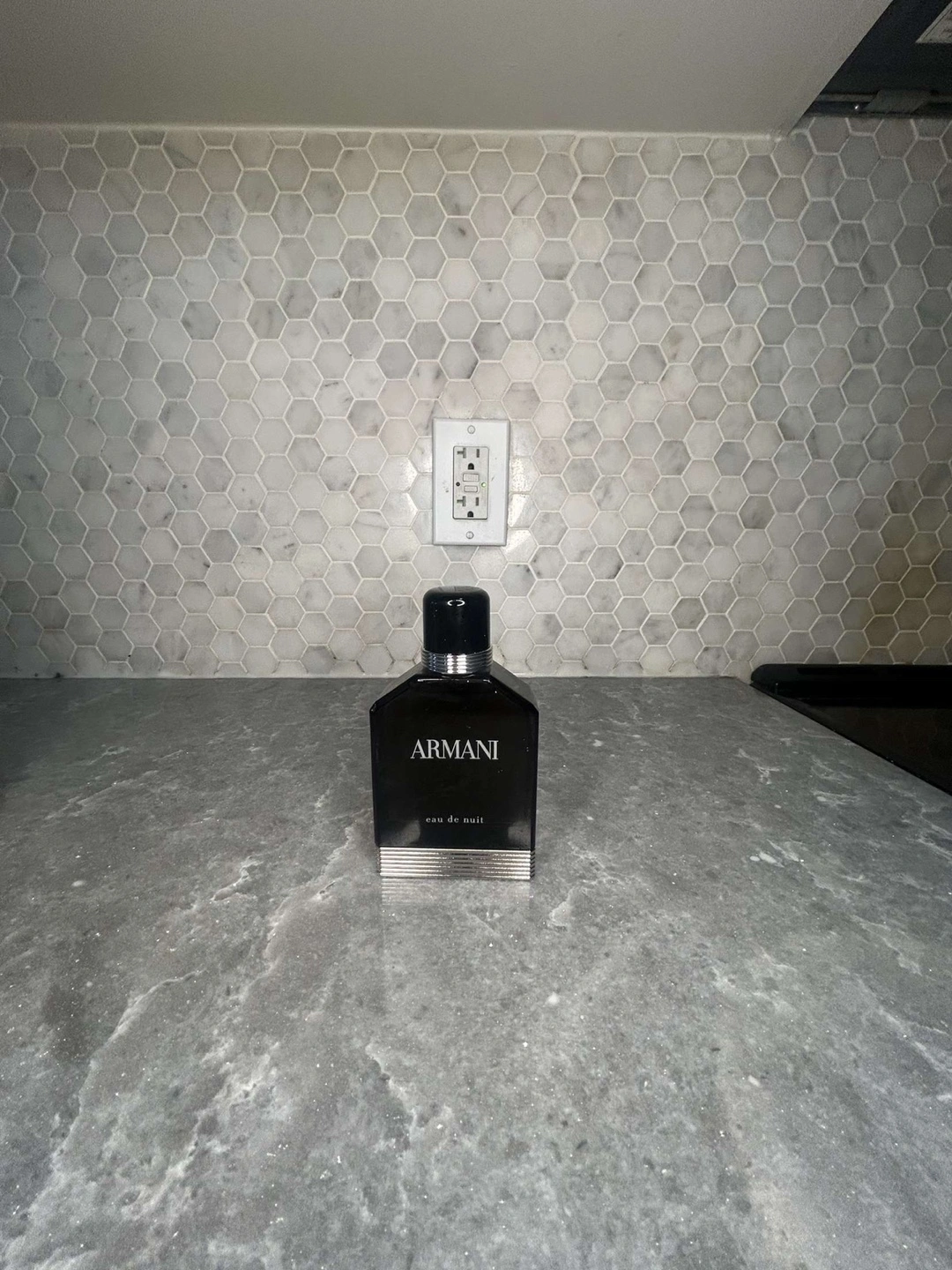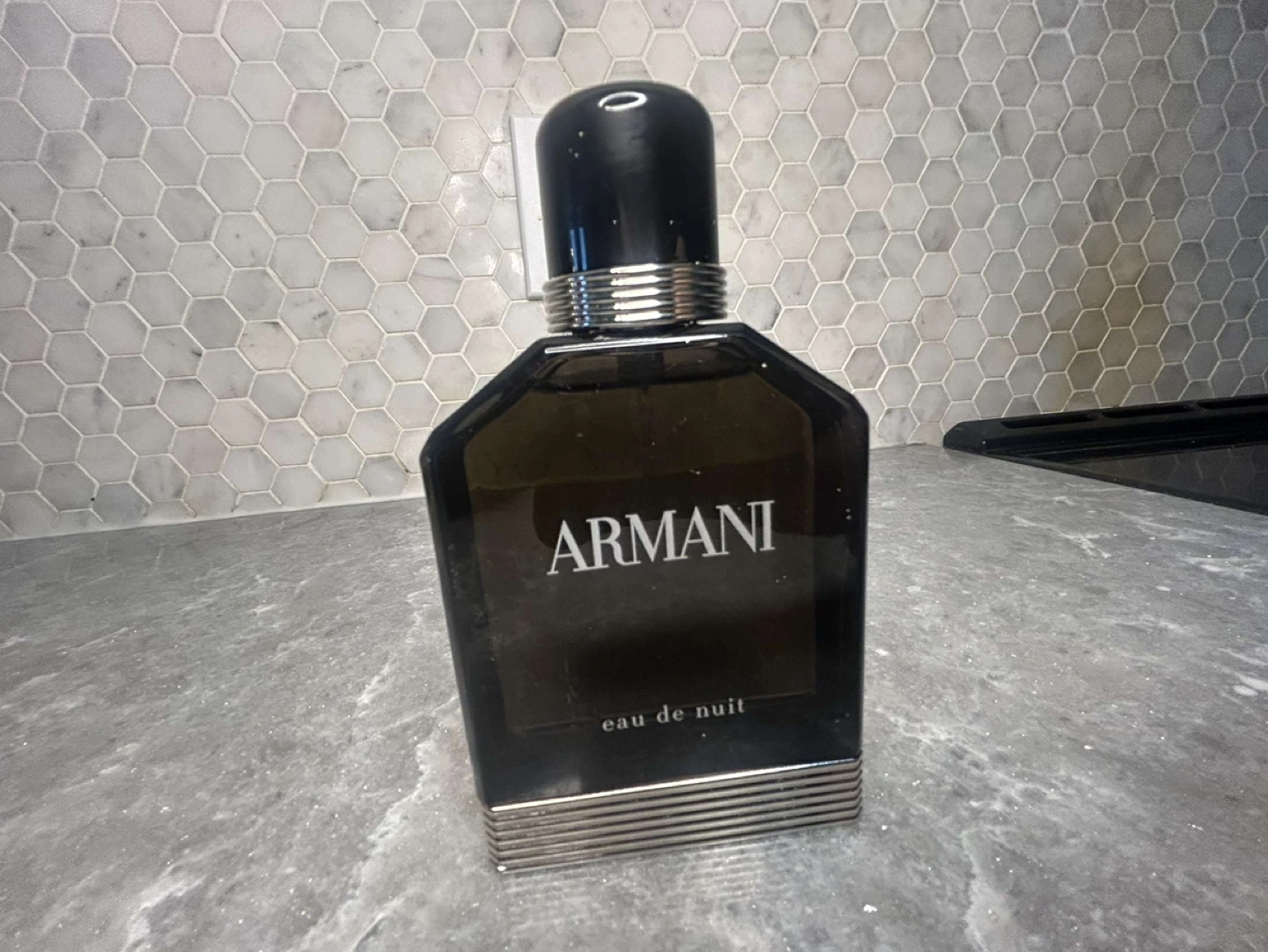 Eau de Nuit fragrance by Giorgio Armani. Dark brown glass bottle, silver accents. Black cap.