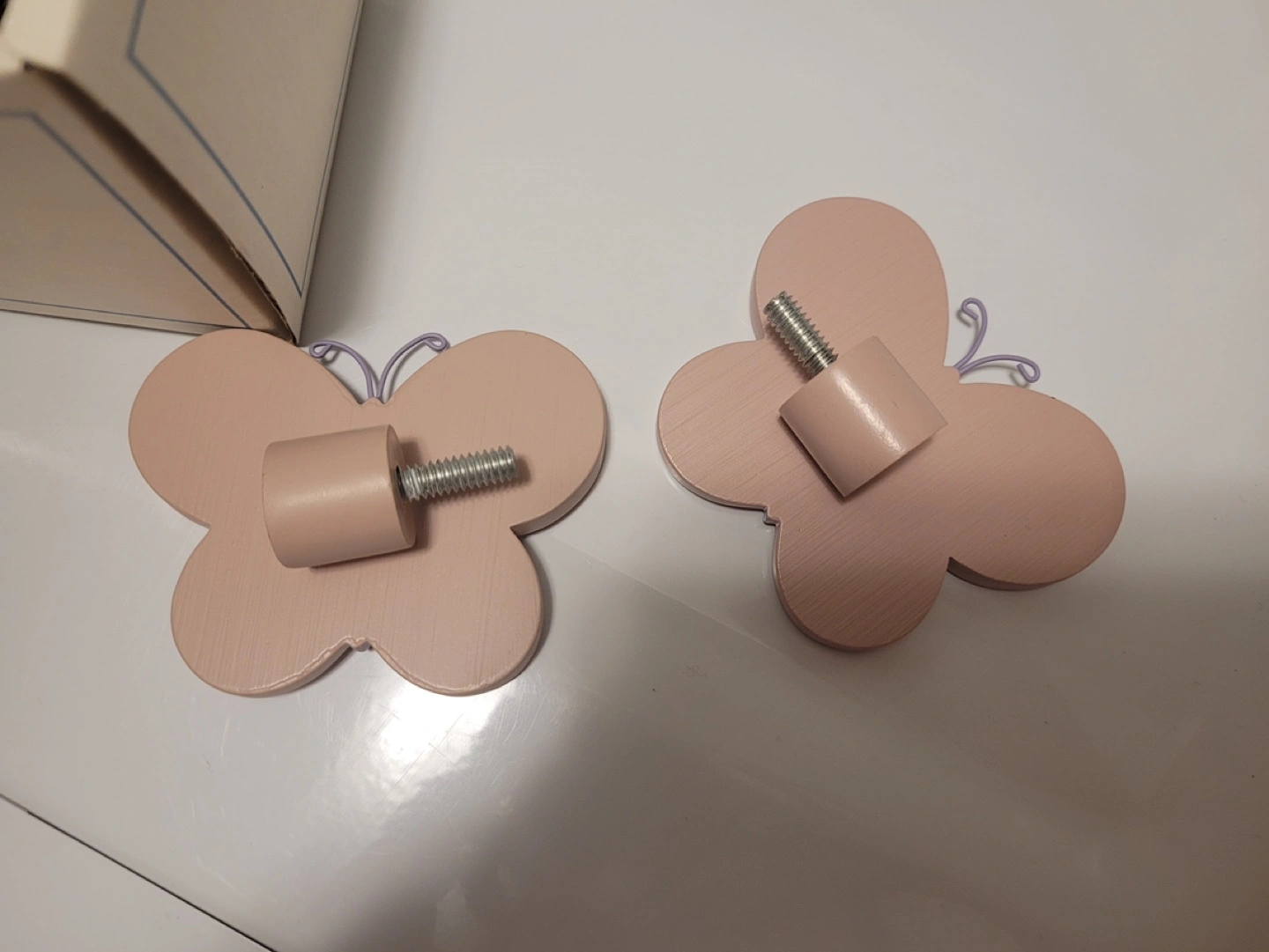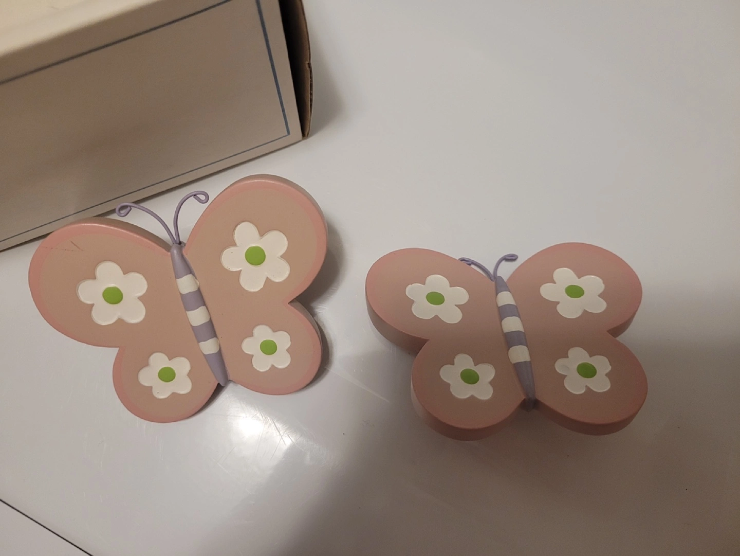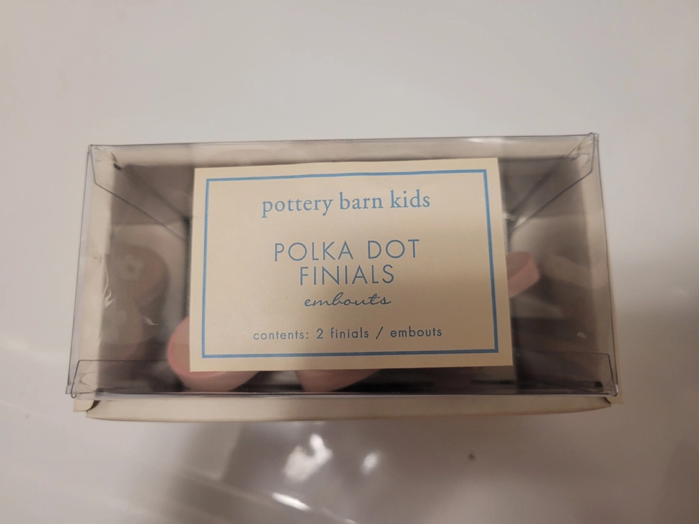 Pair of pink butterfly finials from Pottery Barn. Polka dot design. Screws included. Brand new in box.