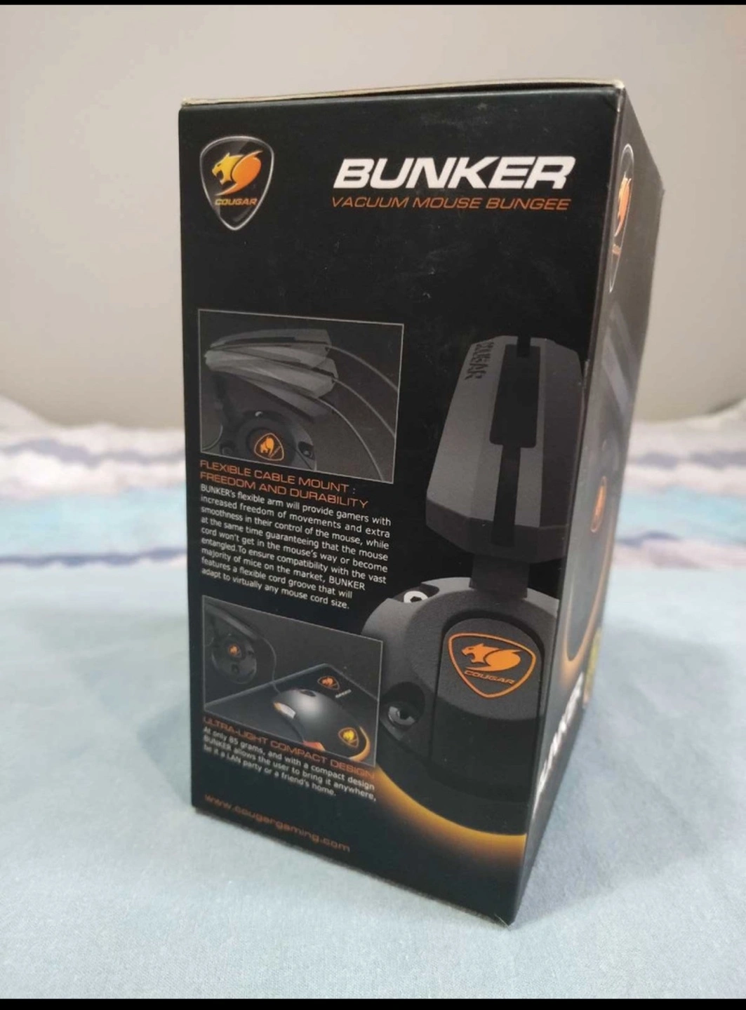 Sold as listed. - Flexible cable mount design provides gamers with increased freedom of movements during play while keeping the mouse cord out of the way - Made to adapt to virtually any mouse cord size available on the market - Superior Vacuum suction pad provides unsurpassed levels of steadiness even on slightly uneven surfaces https://cougargaming.com/products/accessories/bunker/ https://www.amazon.ca/Cougar-Bunker-Mouse-Bungee-Stability/dp/B01HU44Q7G