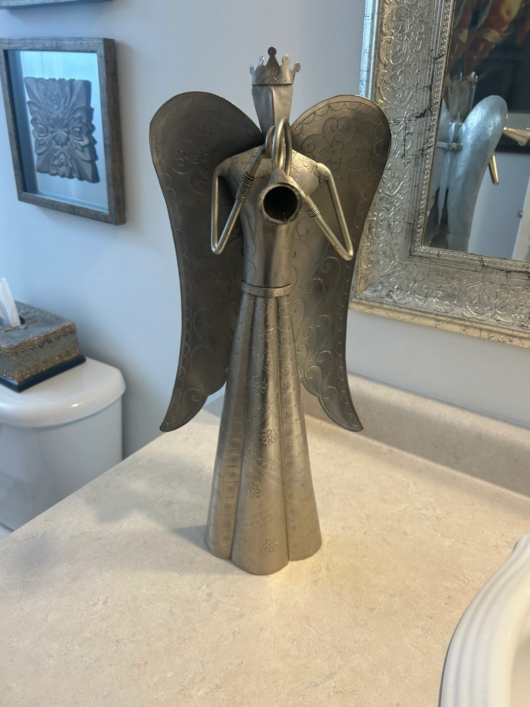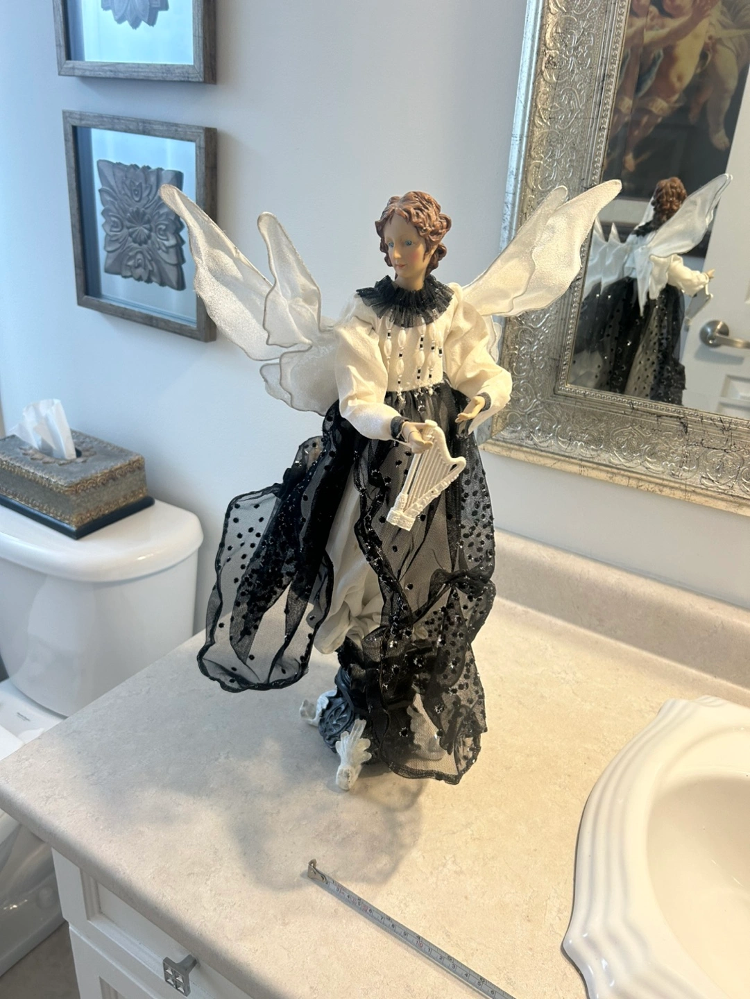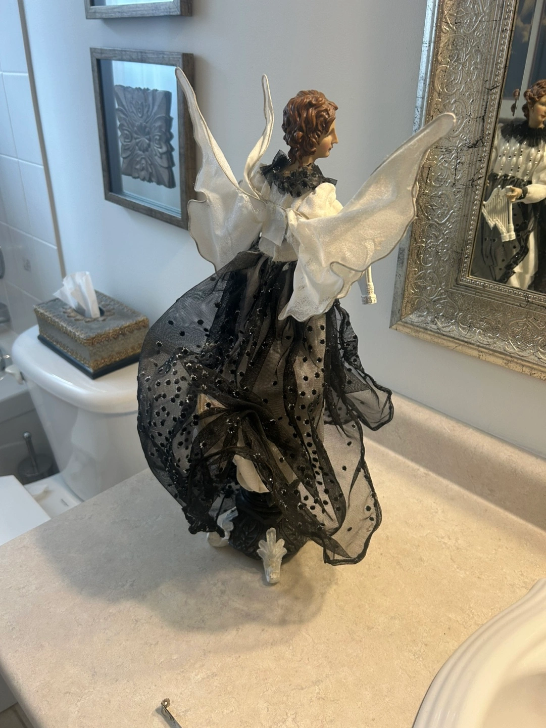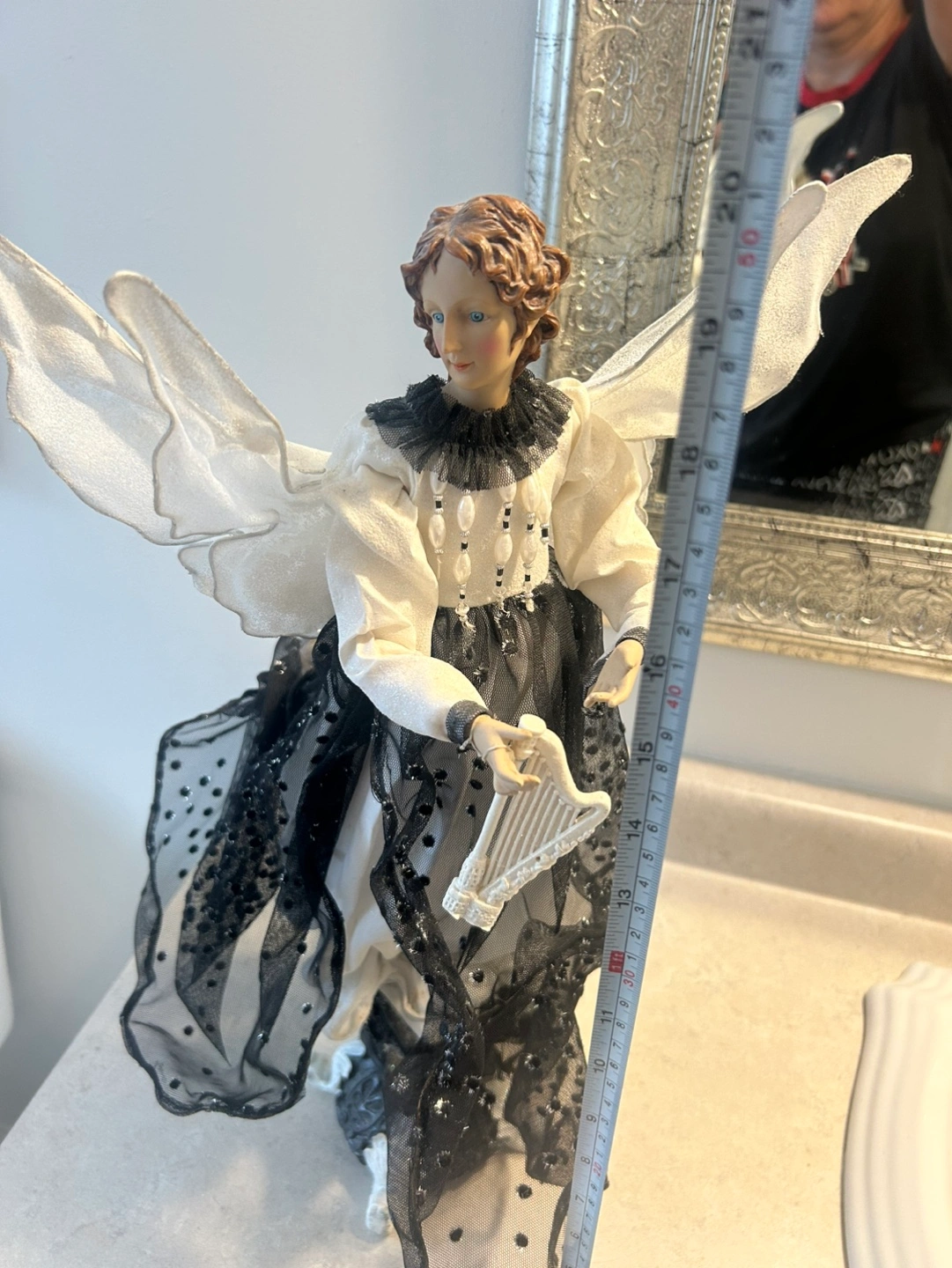 lovely angel figurines. One metal angel with a crown, playing a trumpet. One porcelain angel in a black and white dress, playing a harp. Great for holiday decor or year-round display. $5.00 each or $15.00 for all three