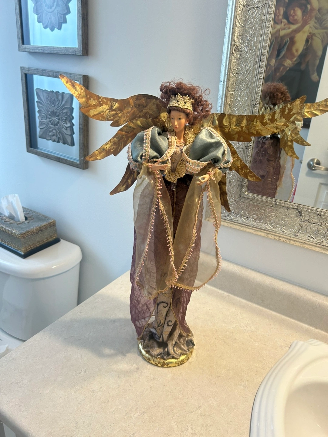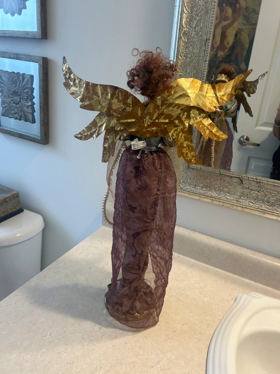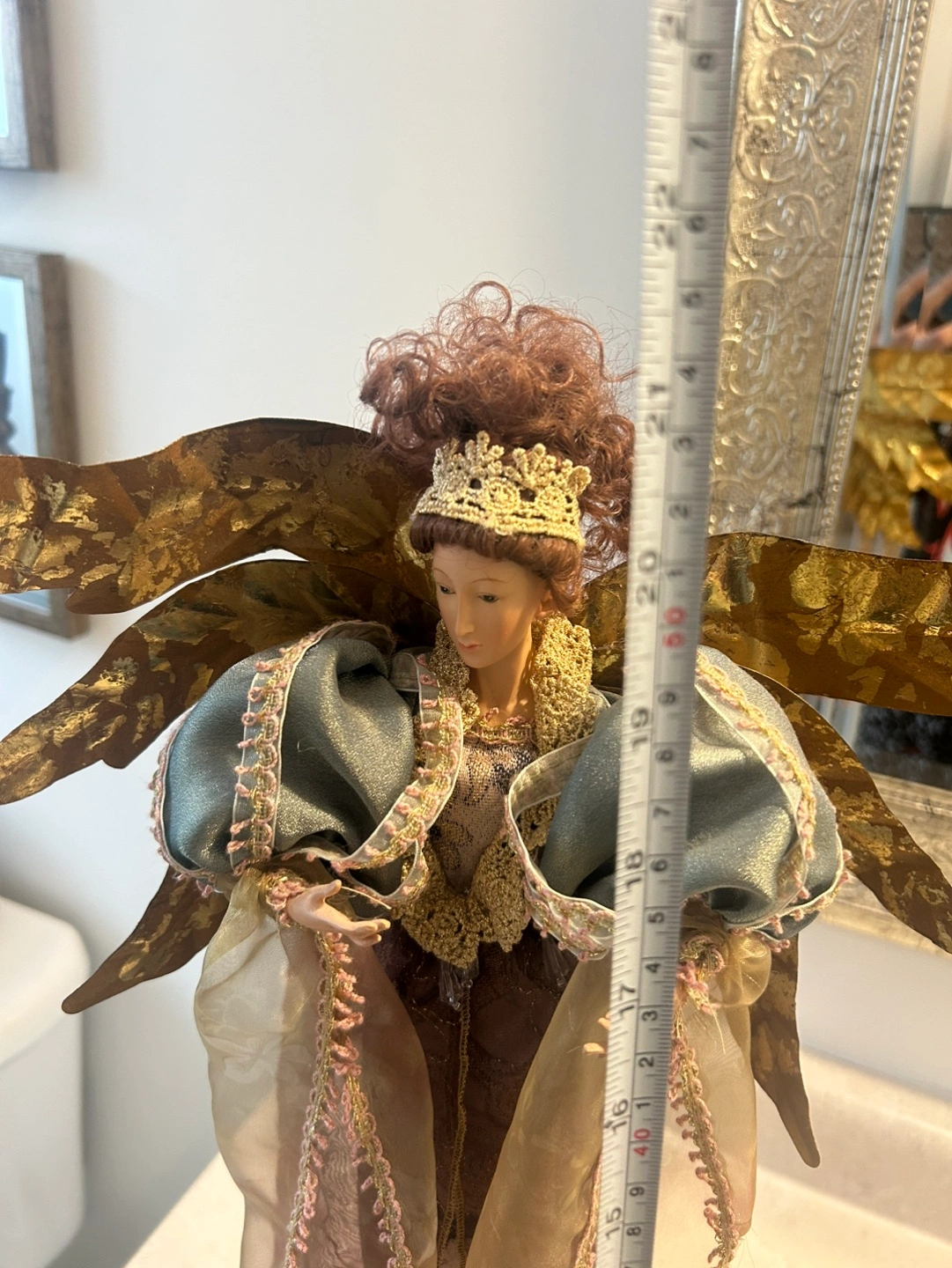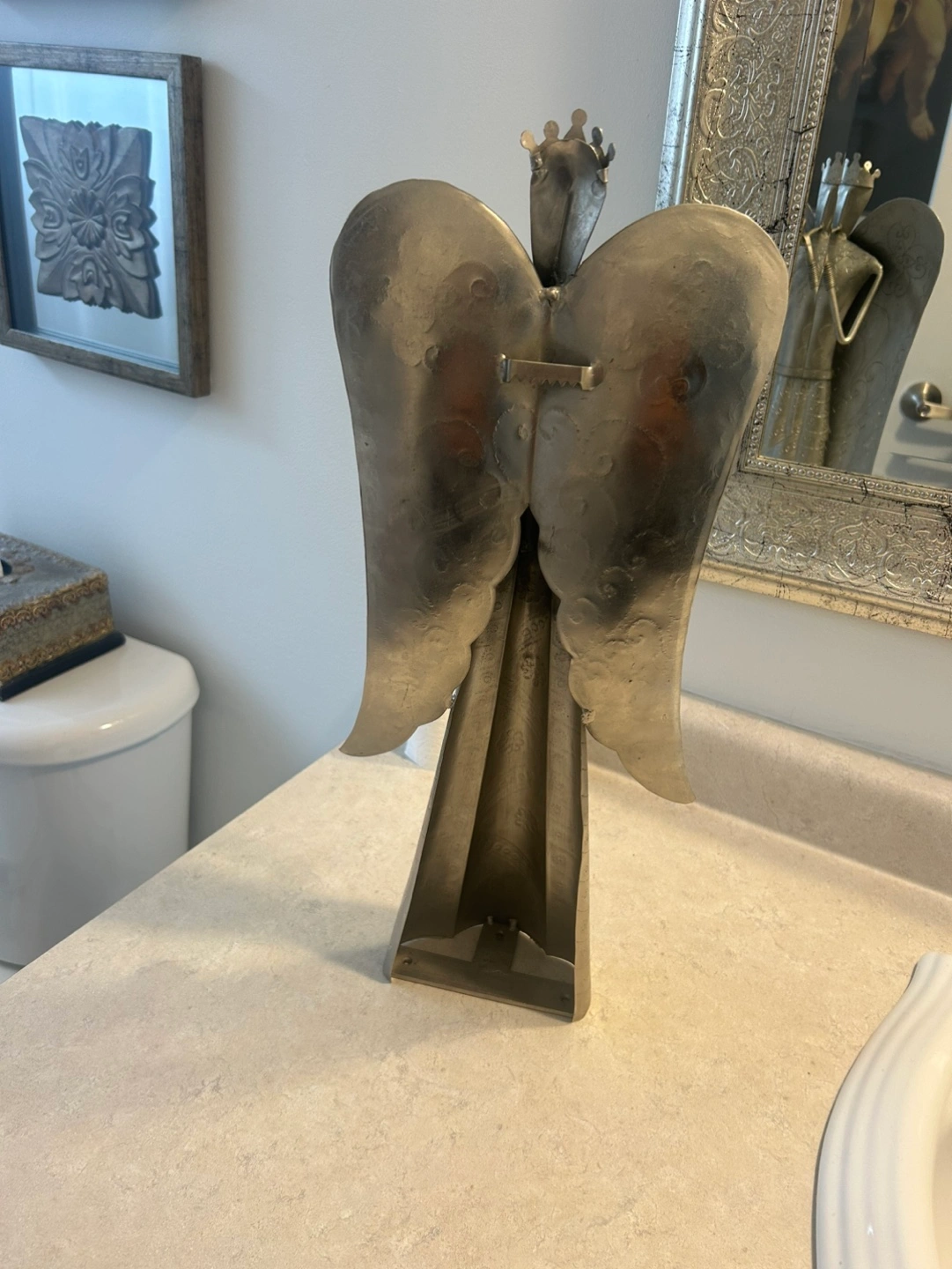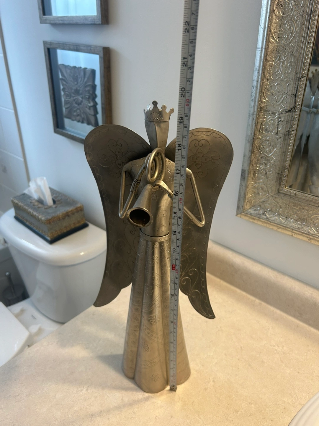 lovely angel figurines. One metal angel with a crown, playing a trumpet. One porcelain angel in a black and white dress, playing a harp. Great for holiday decor or year-round display. $5.00 each or $15.00 for all three