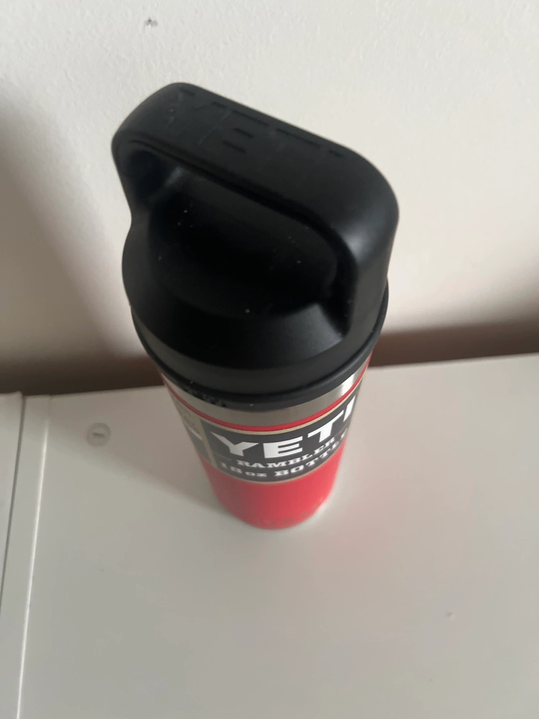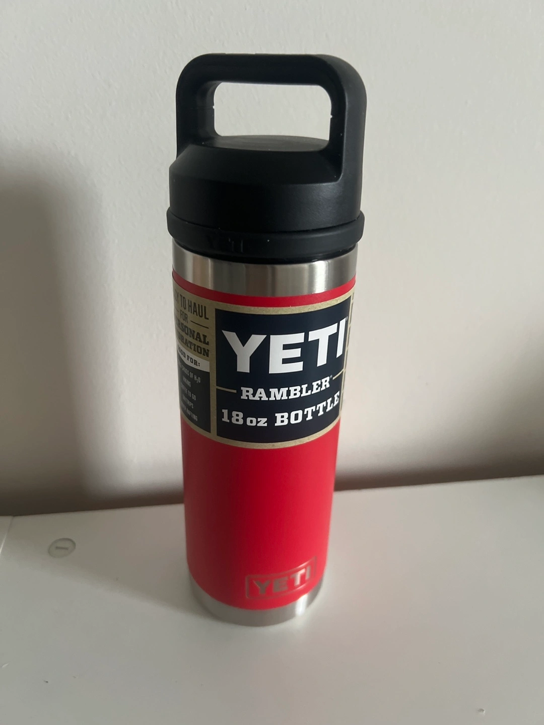 18 oz YETI Rambler bottle. Red colour. Stainless steel construction. Durable and keeps drinks cold or hot. Carry handle.