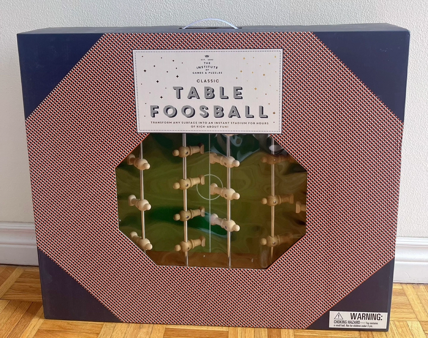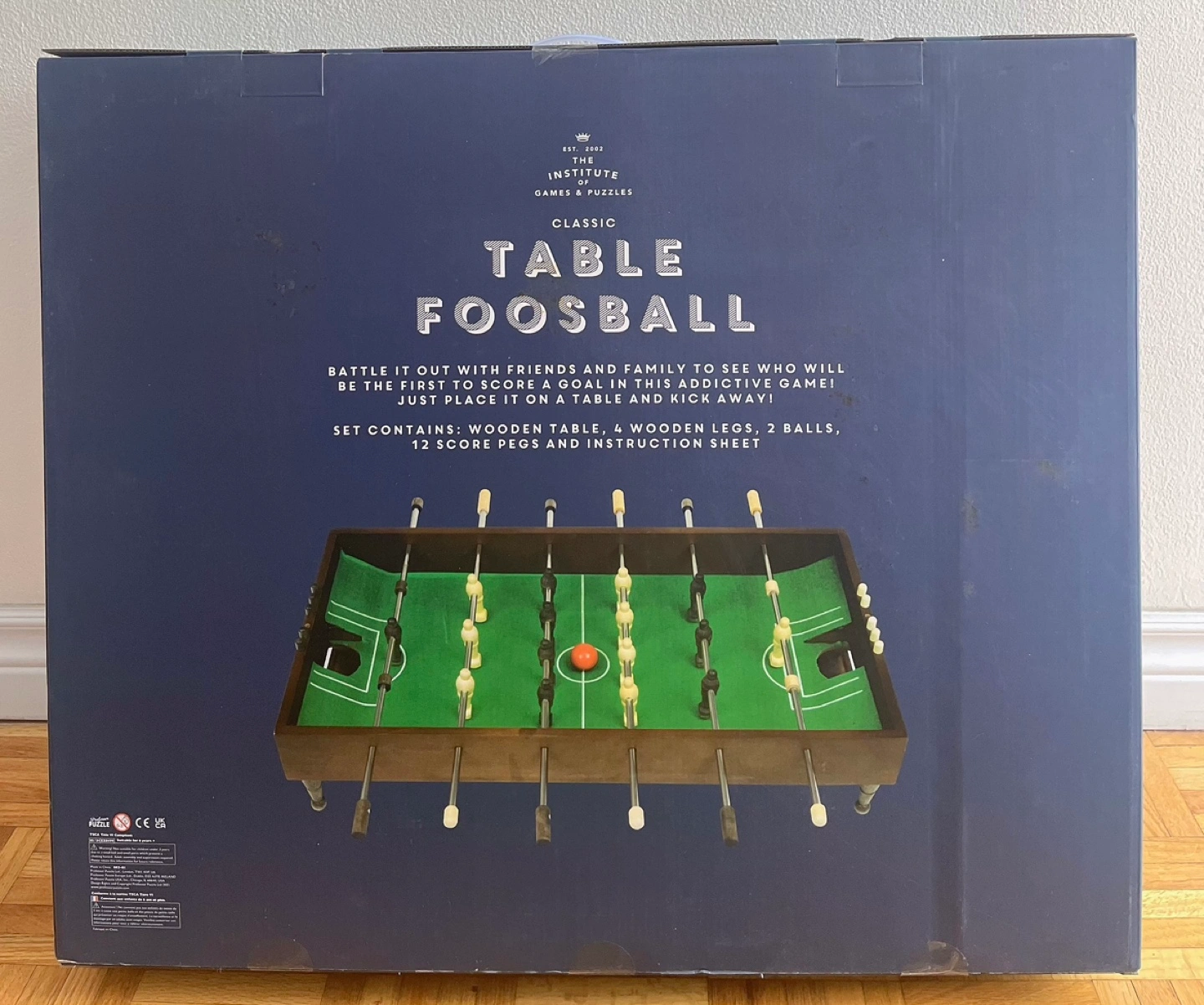 Brand new.Fun tabletop foosball game. Perfect for family game night. Includes wooden table, 4 wooden legs, 2 balls, 12 score pegs and instruction sheet.Easy setup. Cash only