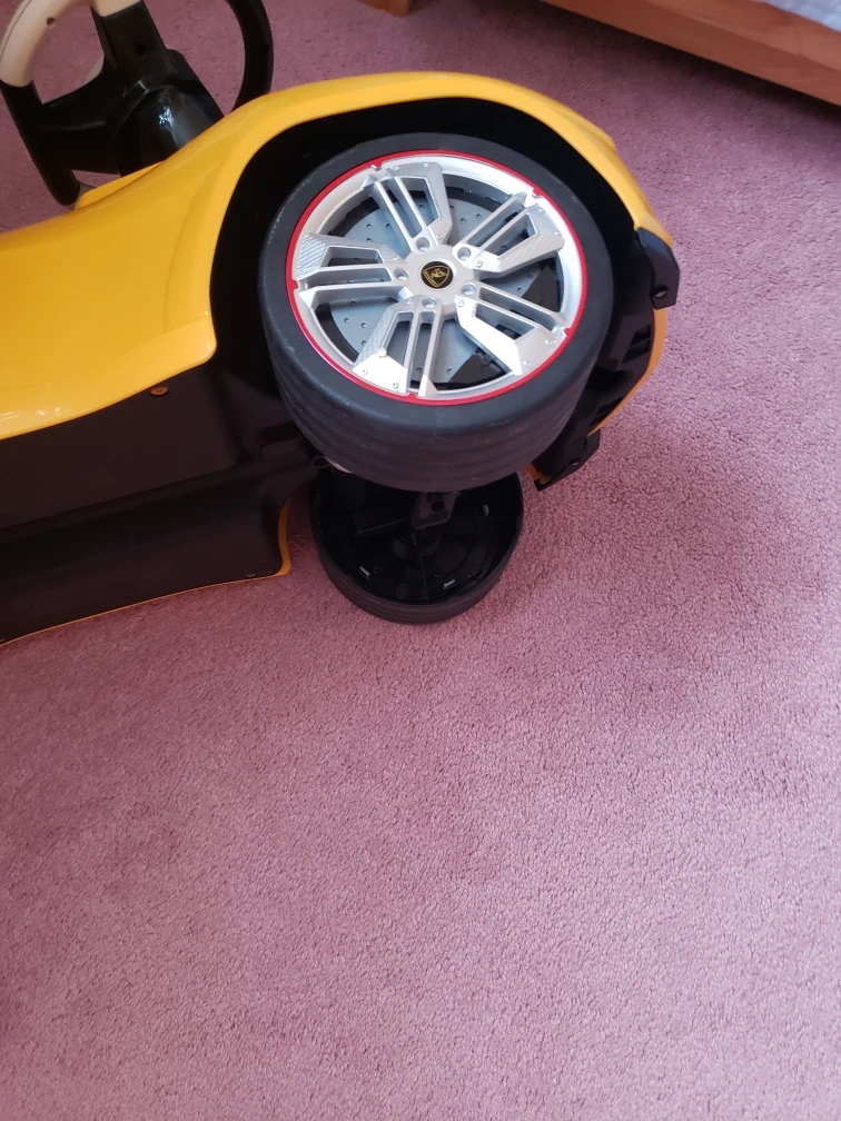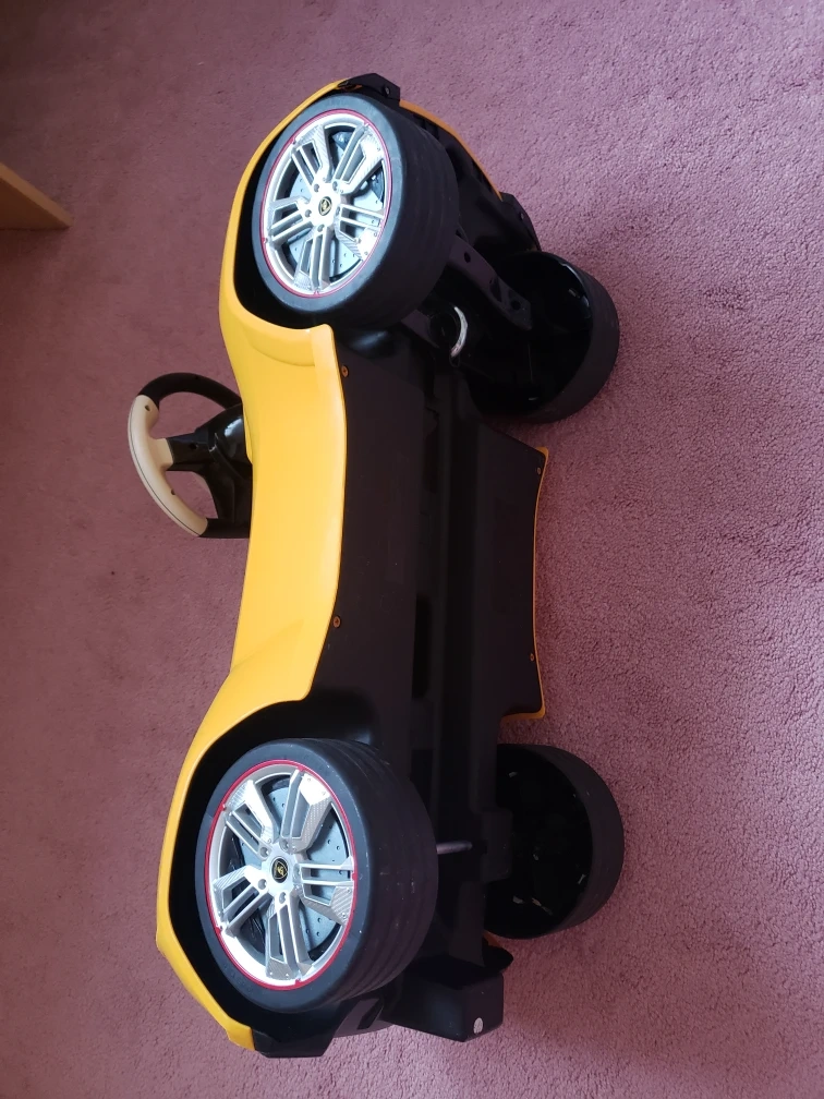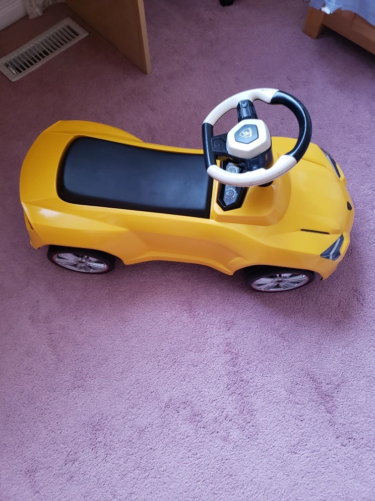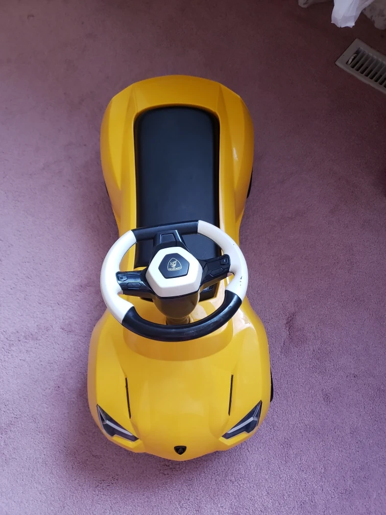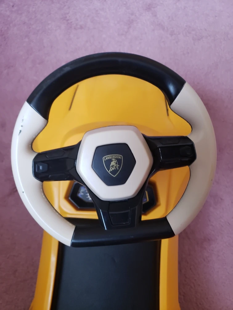 Yellow Lamborghini-licensed ride-on toy car. Features a steering wheel, comfortable seat, and realistic design. Great for toddlers.