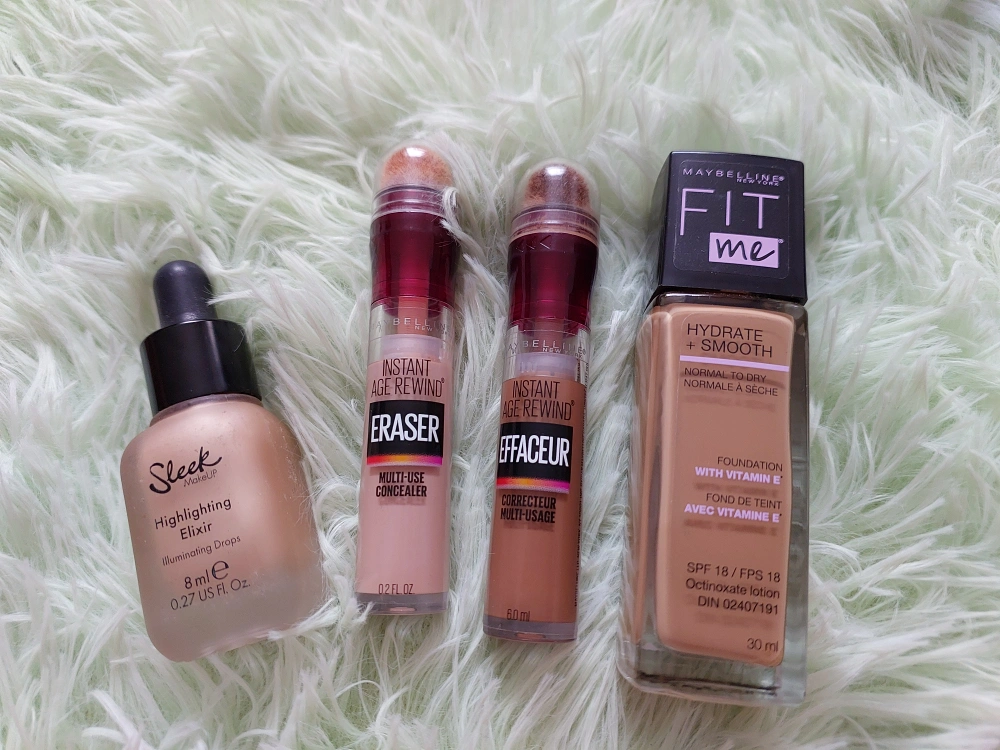 Bundle includes Sleek Makeup Highlighting Elixir, two Maybelline Instant Age Rewind Eraser concealers, and a Maybelline Fit Me foundation. Various shades. Lightly used.