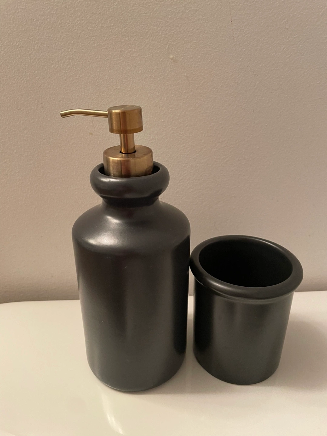 Modern bathroom set. Dark grey ceramic soap dispenser with gold pump. Matching cylindrical tumbler. Stylish and functional.