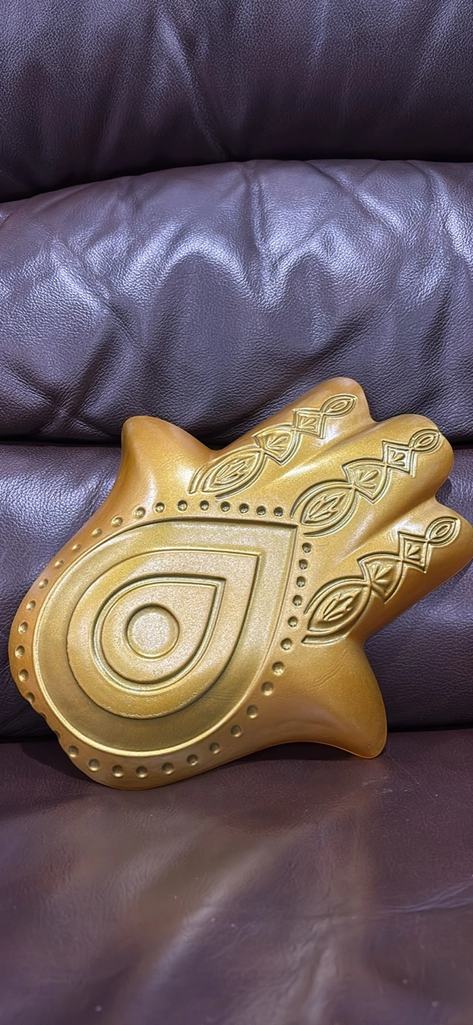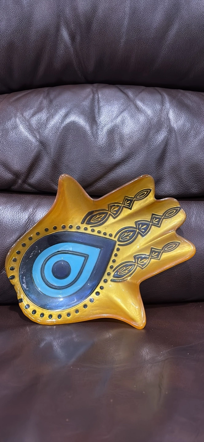 Gorgeous gold hamsa hand dish. Features a detailed design and an evil eye. Perfect for jewellery or trinkets. Decorative piece.