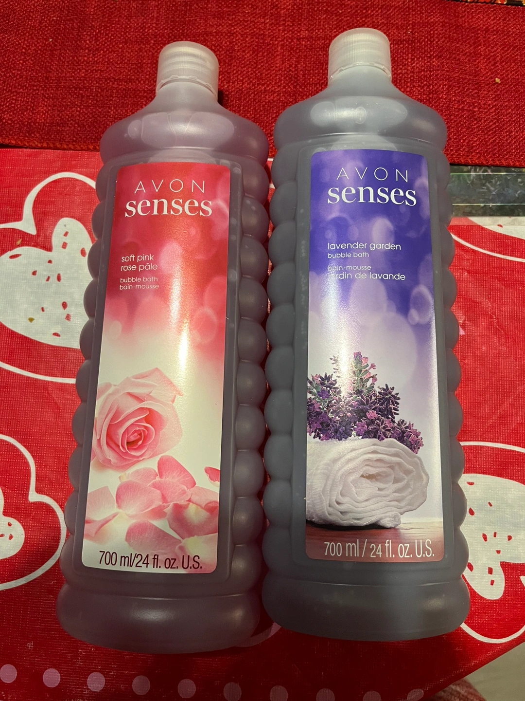Two bottles of Avon Senses bubble bath. One is Soft Pink Rose, the other Lavender Garden. Each bottle is 700 ml / 24 fl. oz. More scents to choose from. Tranquility, Vanilla… Go to my website Www.Avon.ca/boutique/EmilyT Contact Emily (416) 816 9955