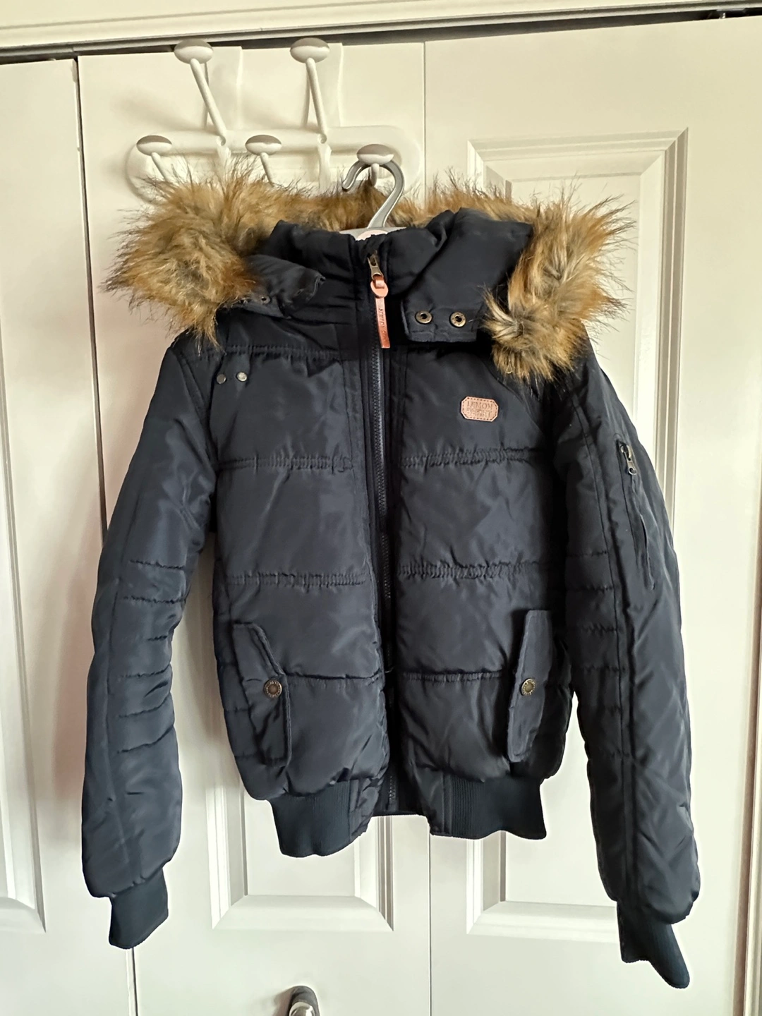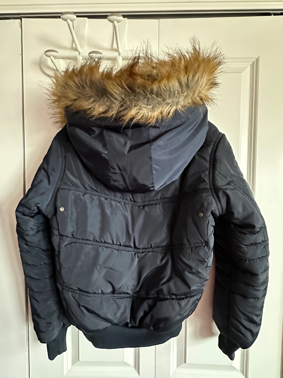 Warm winter jacket. Navy blue colour. Features a faux fur lined hood. Zipper closure. Size 152. Never worn Fits also women size XS-S